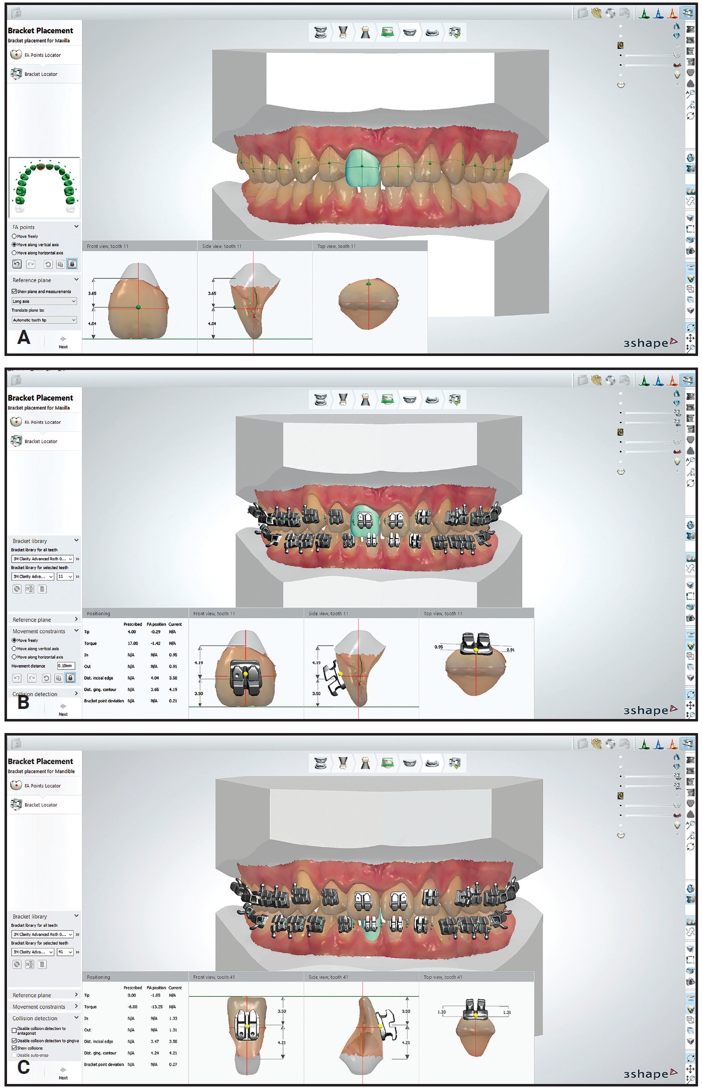 Fig. 4 A. Facial axis points adjusted on virtual model. B. Brackets positioned and adjusted on maxillary arch. C. Brackets positioned and adjusted on mandibular arch.