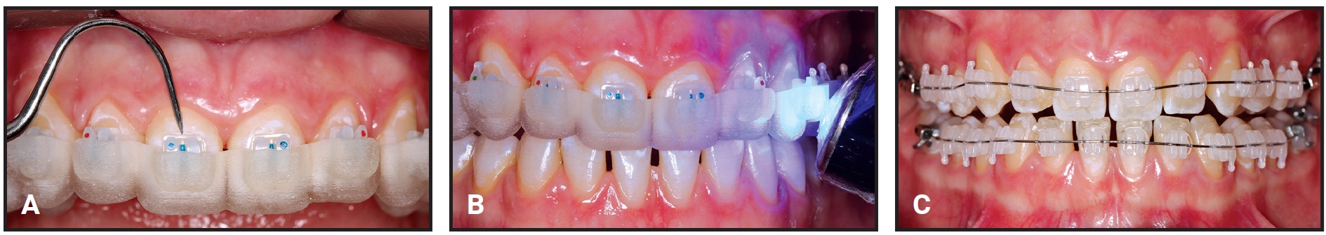Fig. 9 A. Flash removed from around bracket base with maxillary tray seated. B. Light-curing of composite. C. Bonding completed and archwires inserted.