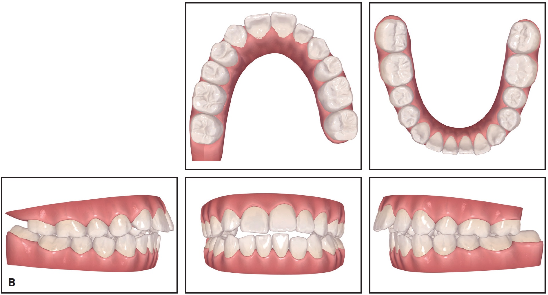 At this point, buttons were bonded to the lower first molars, and hooks were bonded directly to the upper right first premolar and left canine. The patient was instructed to use Class II elastics for 20 hours per day.20,22 During distalization of the upper molars, the occlusal coverage of the aligners reduced interference from opposing teeth and controlled the vertical position of the crowns.