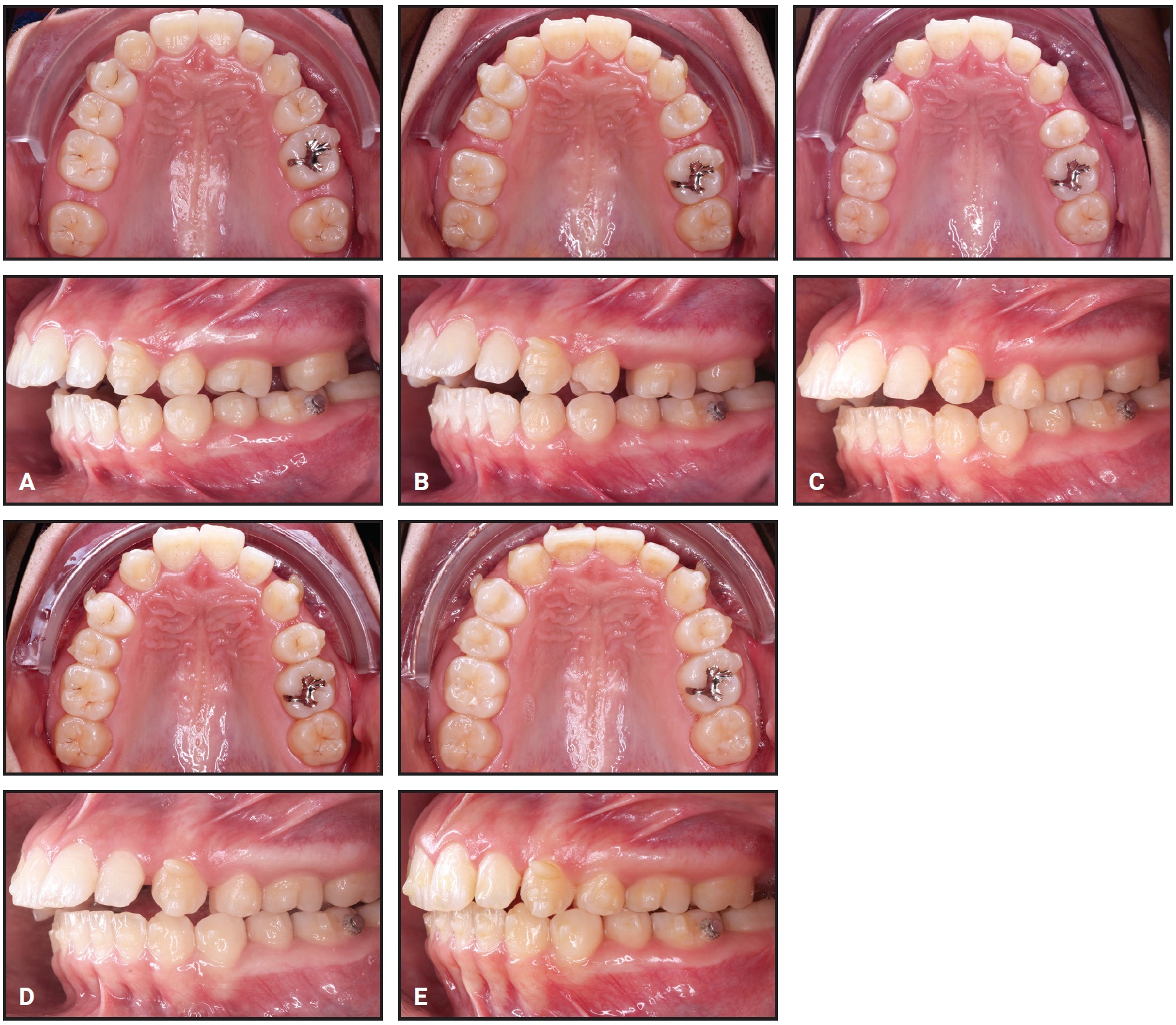 Fig. 4 Sequential distalization. A. Distalization of second molars completed after five weeks of treatment. B. Distalization of first molars completed after three months of treatment. C. Distalization of premolars completed after five months of treatment. D. Distalization of canines completed after seven months of treatment. E. Upper anterior retraction completed after 10 months of treatment.