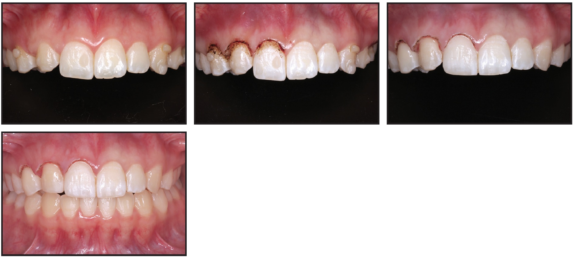 Fig. 5 With upper retraction complete, gingivoplasty performed in upper right anterior region to lengthen crowns and improve gingival margins; upper right canine recontoured to simulate lateral incisor.