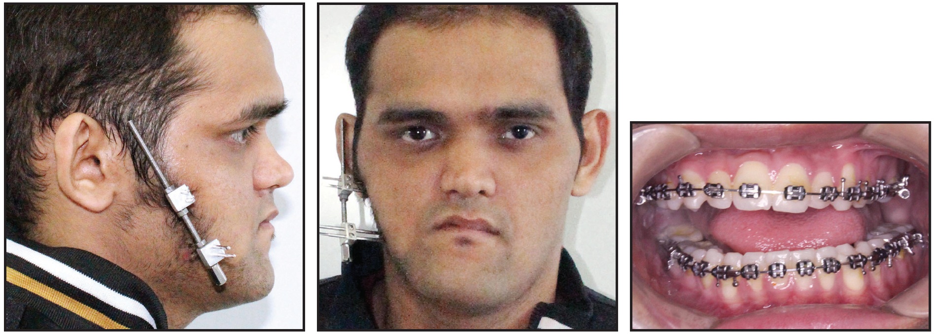 After six months of treatment, an extraoral device was placed to correct the mandibular asymmetry by distraction of the right side (Fig. 4).