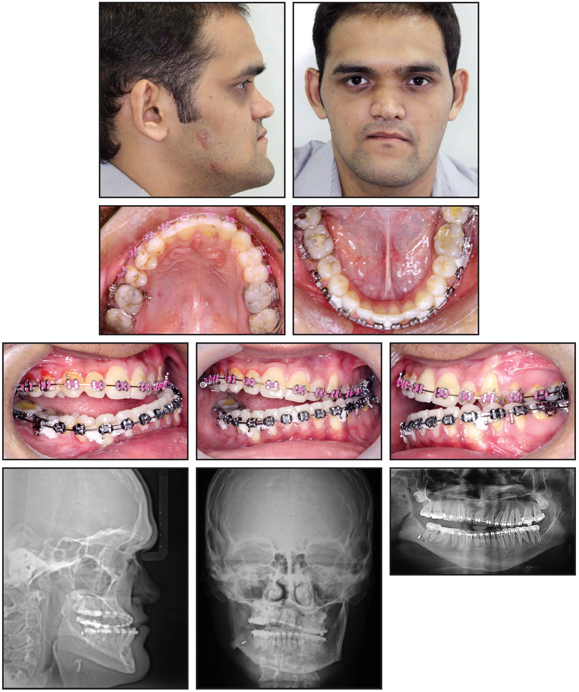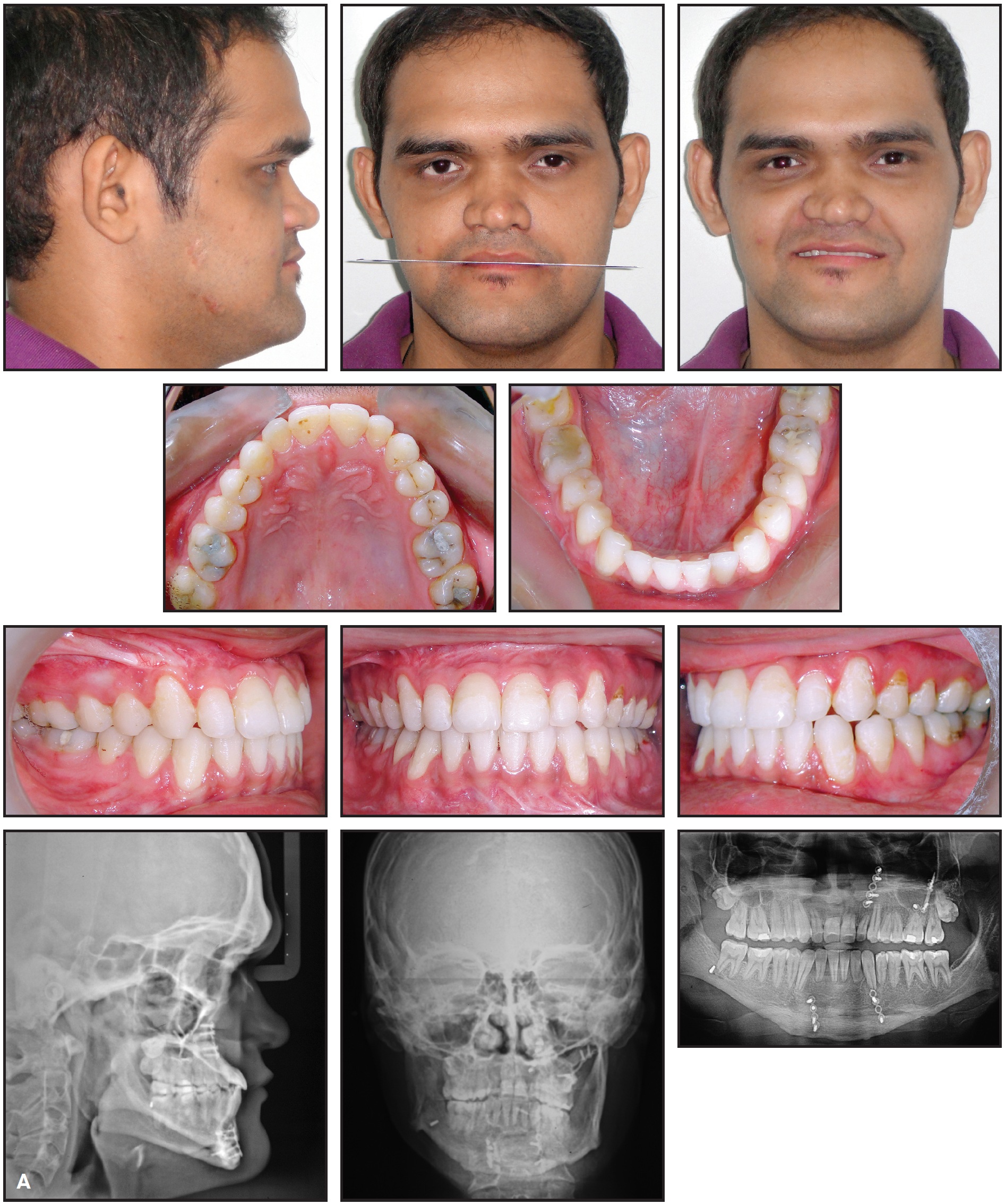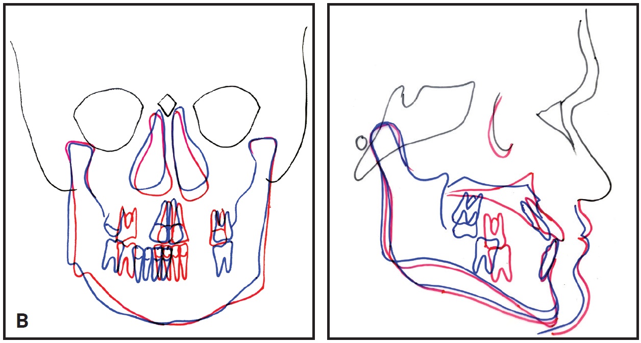 Post-treatment photographs showed marked improvement in the canting of the oral rim, with a centered chin. An esthetic profile and excellent occlusion were achieved. Post-treatment radiographs showed that the difference in mandibular body length on the right and left sides was reduced from 9mm to 3mm. Menton shifted 6mm to the left and was centered on the MSR.