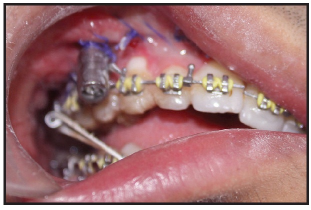 To allow for eventual vertical correction of the maxilla, the interocclusal gap on the right side had been maintained with an acrylic occlusal bite block. A facebow transfer was taken to record the maxillary occlusal plane with respect to the cranium, since the maxilla required correction in both the sagittal and vertical directions. After the models were articulated, a mock surgery was performed to visualize the required amount of correction. A Le Fort I osteotomy was then performed to advance the maxilla by 7mm, along with a genioplasty to correct the chin asymmetry. An intraoral distractor was placed by means of a midpalatal split to elongate the maxilla on the right side, thus correcting the maxillary cant and closing the interocclusal gap (Fig. 7). The upper archwire was cut at the midline to allow vertical descent of the maxilla on the right side (Fig. 8).