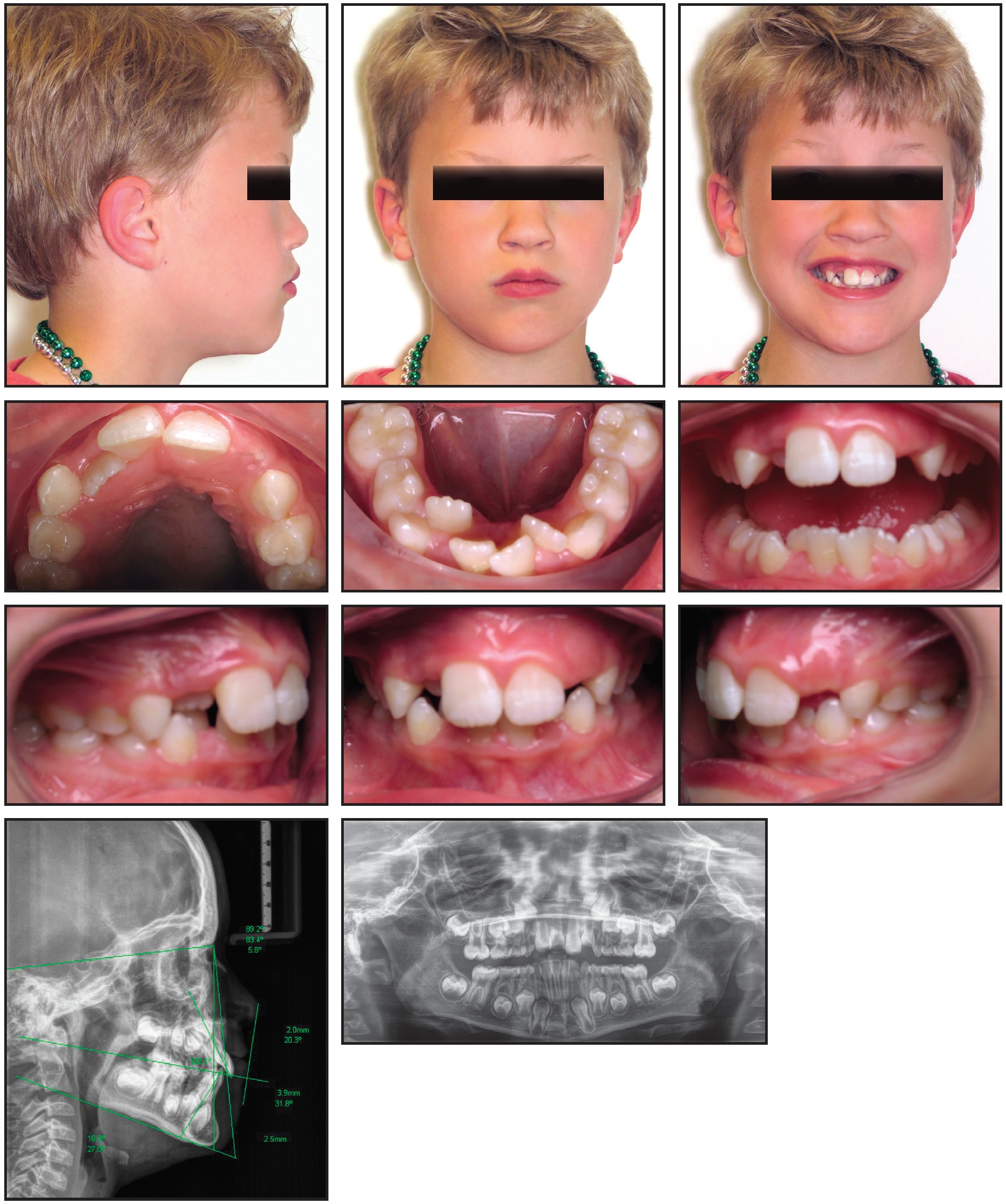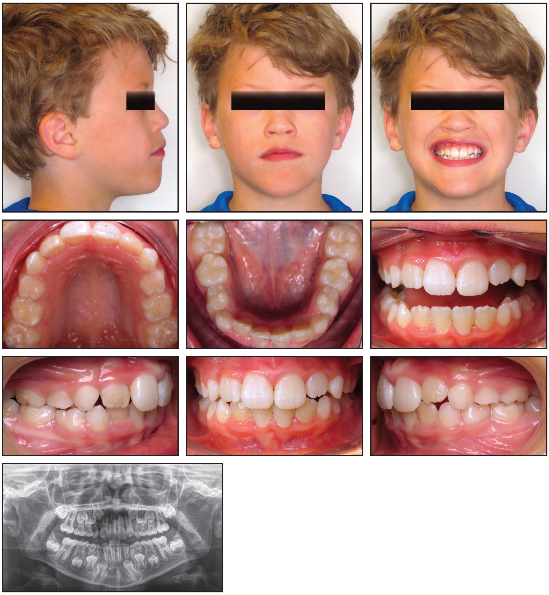 A 9-year-old male in the early mixed dentition presented with severe mandibular crowding, mid-arch narrowing, a deep overbite that was impinging on the palate, a lingually positioned upper right permanent lateral incisor, and an ectopic lower left permanent canine (Fig. 1).