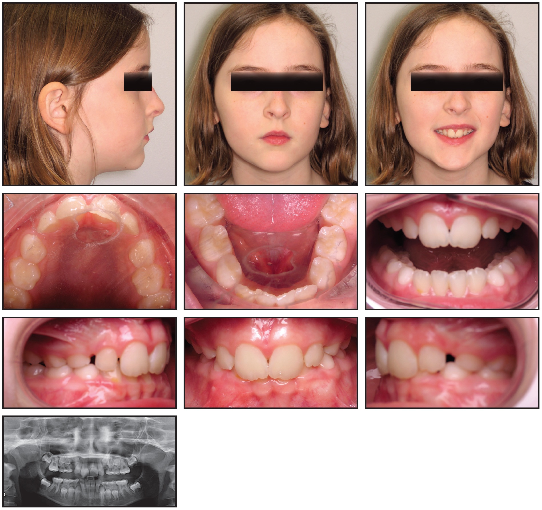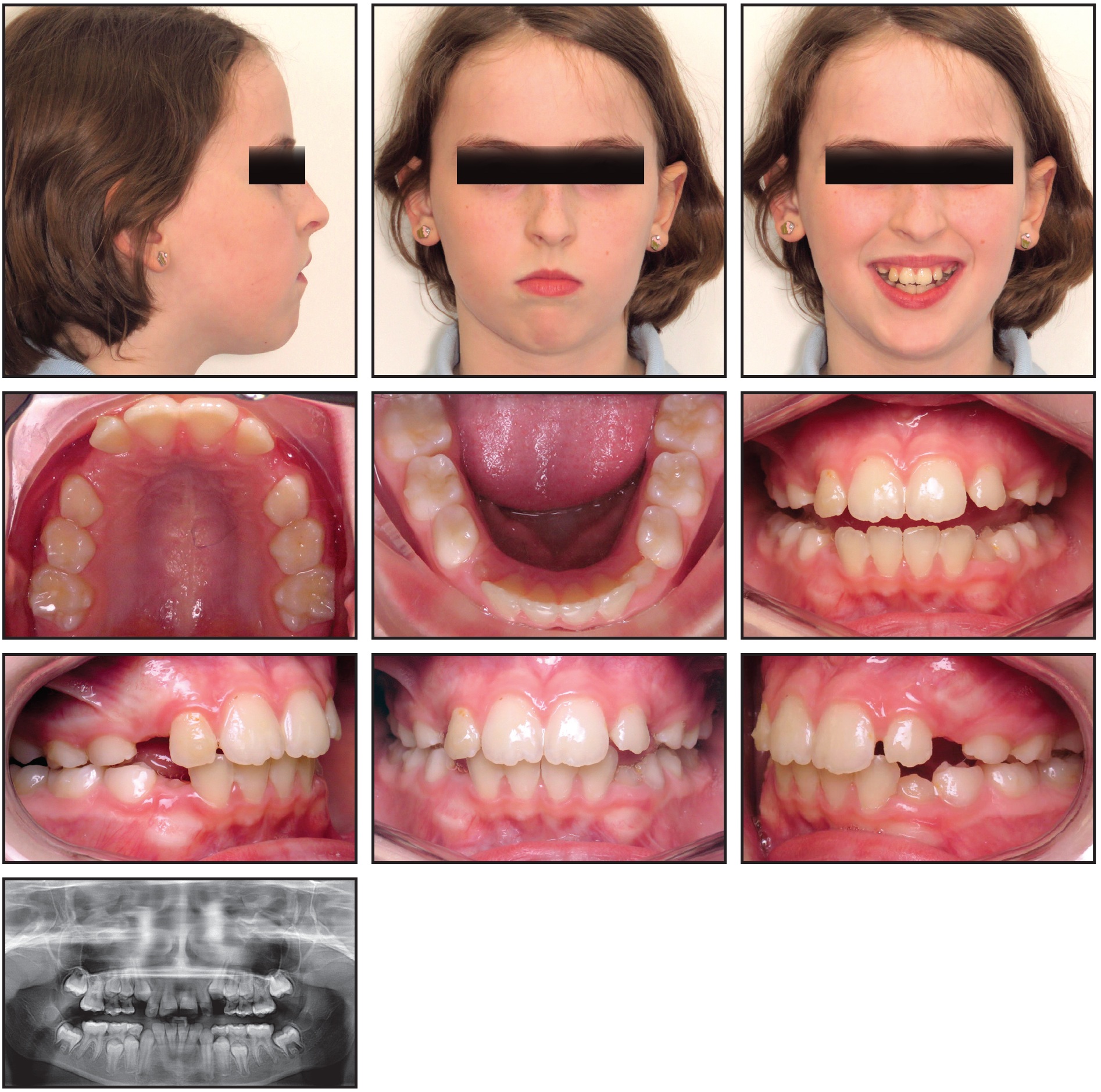 A 9-year-old female presented with an extreme overjet, a deep overbite, and moderate to severe mandibular crowding. All four permanent canines were blocked out due to early loss of the deciduous canines, which were extracted before the patient’s first visit to our office (Fig. 4).