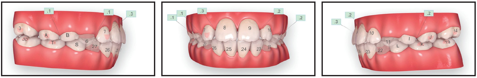 I found it was ideal to start Phase I treatment with Invisalign First at a stage when the deciduous teeth, particularly the first and second molars, would be stable for eight to 12 months. Nevertheless, the loss of the first deciduous molars during treatment did not seem to have a dramatic effect on results. The most predictable treatment outcomes involved Class II malocclusions in which the molars needed to be rotated and slightly distalized, as well as cases with mild maxillary or mandibular constriction in which I felt comfortable expanding the arch by as much as 5mm. Class III patients with functional shifts requiring light elastics also responded well to aligner treatment.