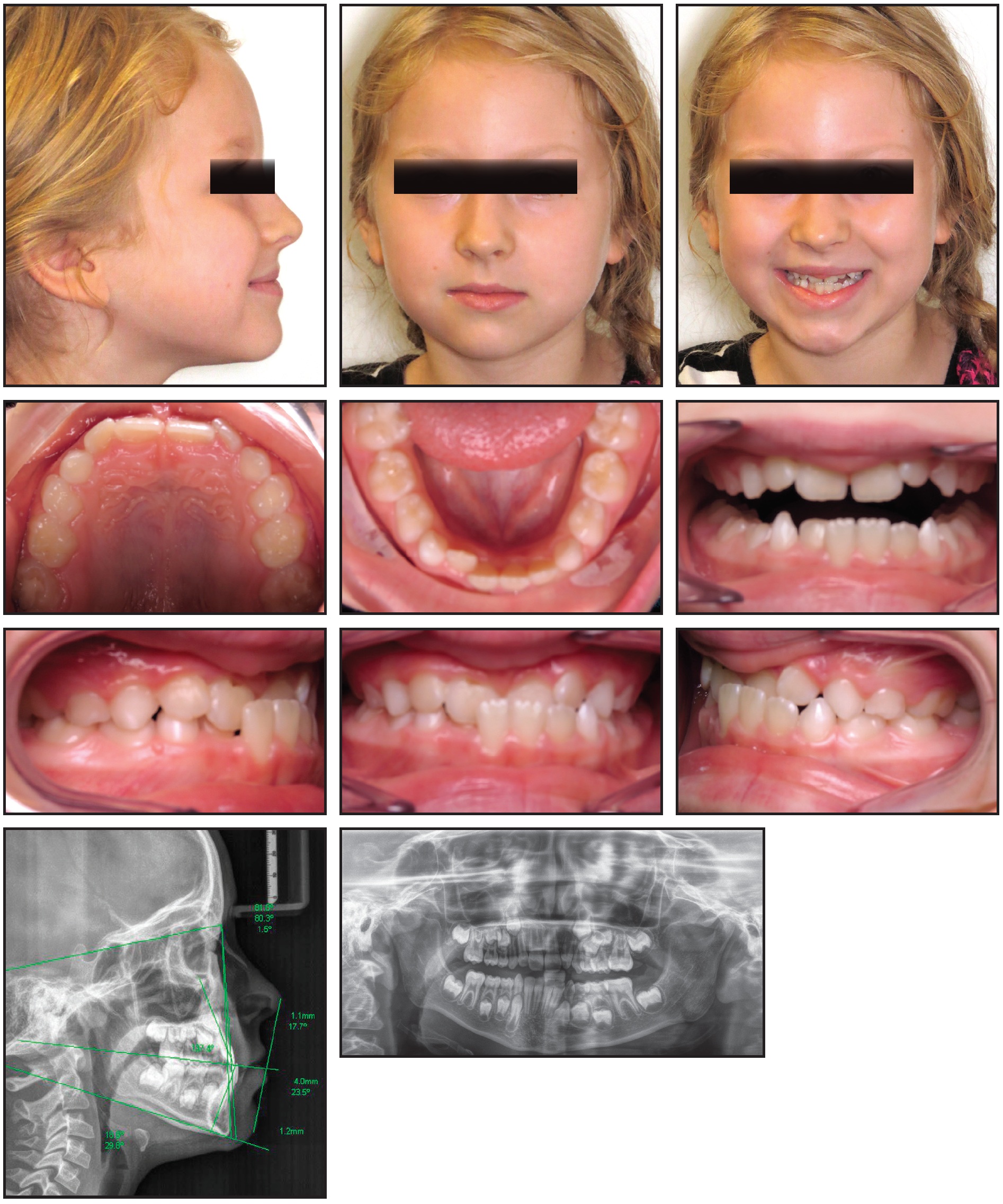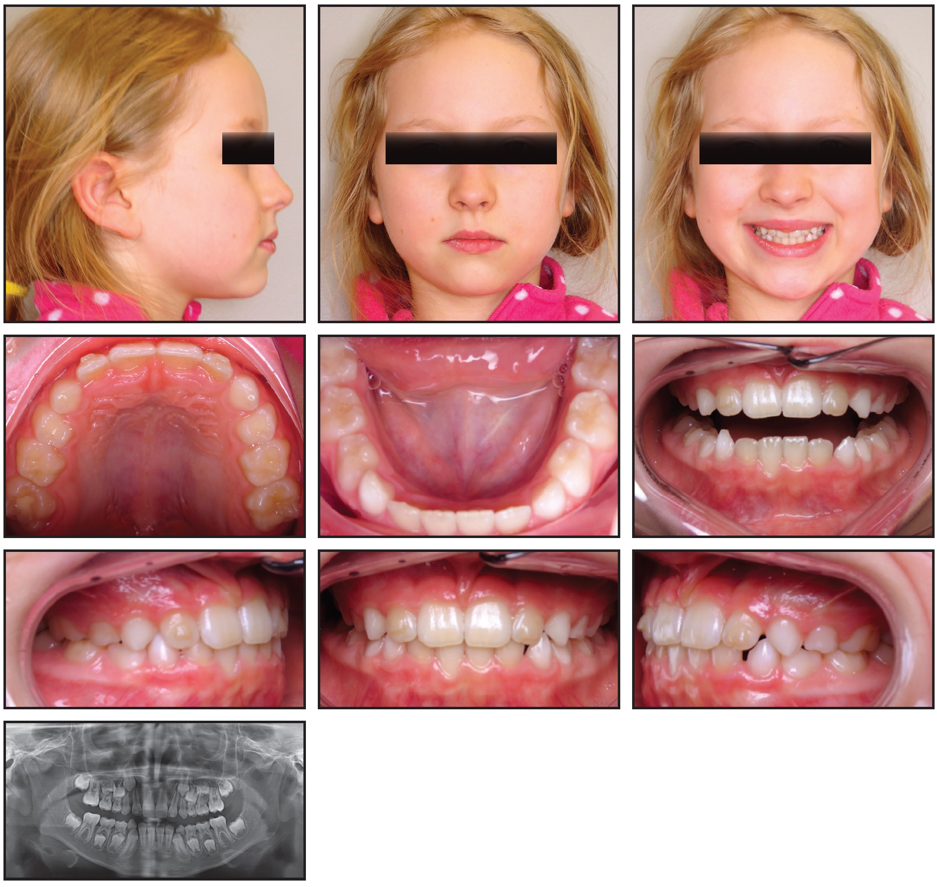 Fig. 4 Case 2. 9-year-old female patient with Class II, division 1 malocclusion, deep overbite, mandibular crowding, and impacted permanent canines before treatment.