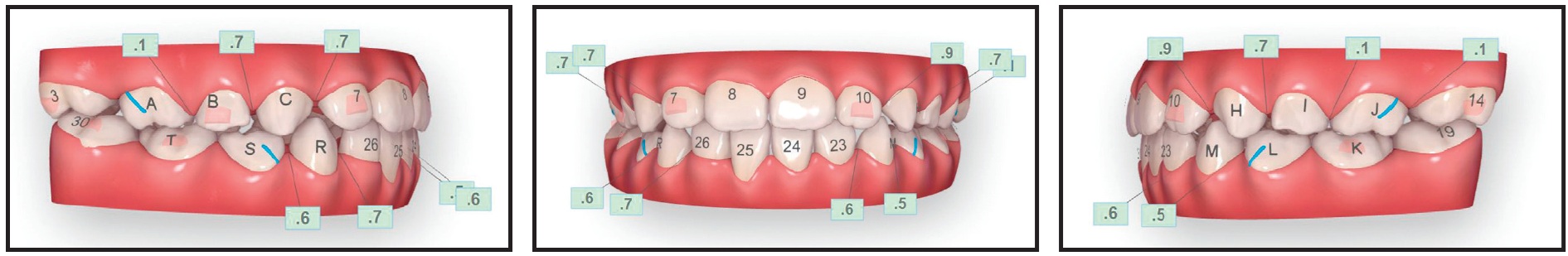 The crowding and deep bite would be addressed through upper first-molar rotation and incisor proclination, respectively. Mesial root tip of the lateral incisors and interproximal leeway space were built into the ClinCheck* plan to accommodate the erupting permanent teeth.