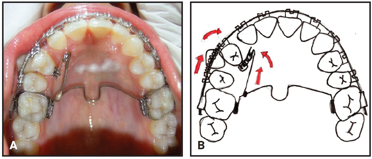 To align the transposed canine, a modified TPA was fabricated from 20-gauge stainless steel wire** (Fig. 2). An additional wire was soldered to the right arm and extended horizontally to the distal surface of the lateral incisor, where it was bent into a hook. A Begg bracket was bonded to the palatal surface of the first premolar, and the modified TPA was activated monthly by attaching a medium-spaced elastomeric chain from the hook to the bracket and securing it with .009" ligature wire. On the buccal side, an open-coil spring was placed between the upper right first and second premolars to counteract the mesiobuccal rotation of the first premolar.