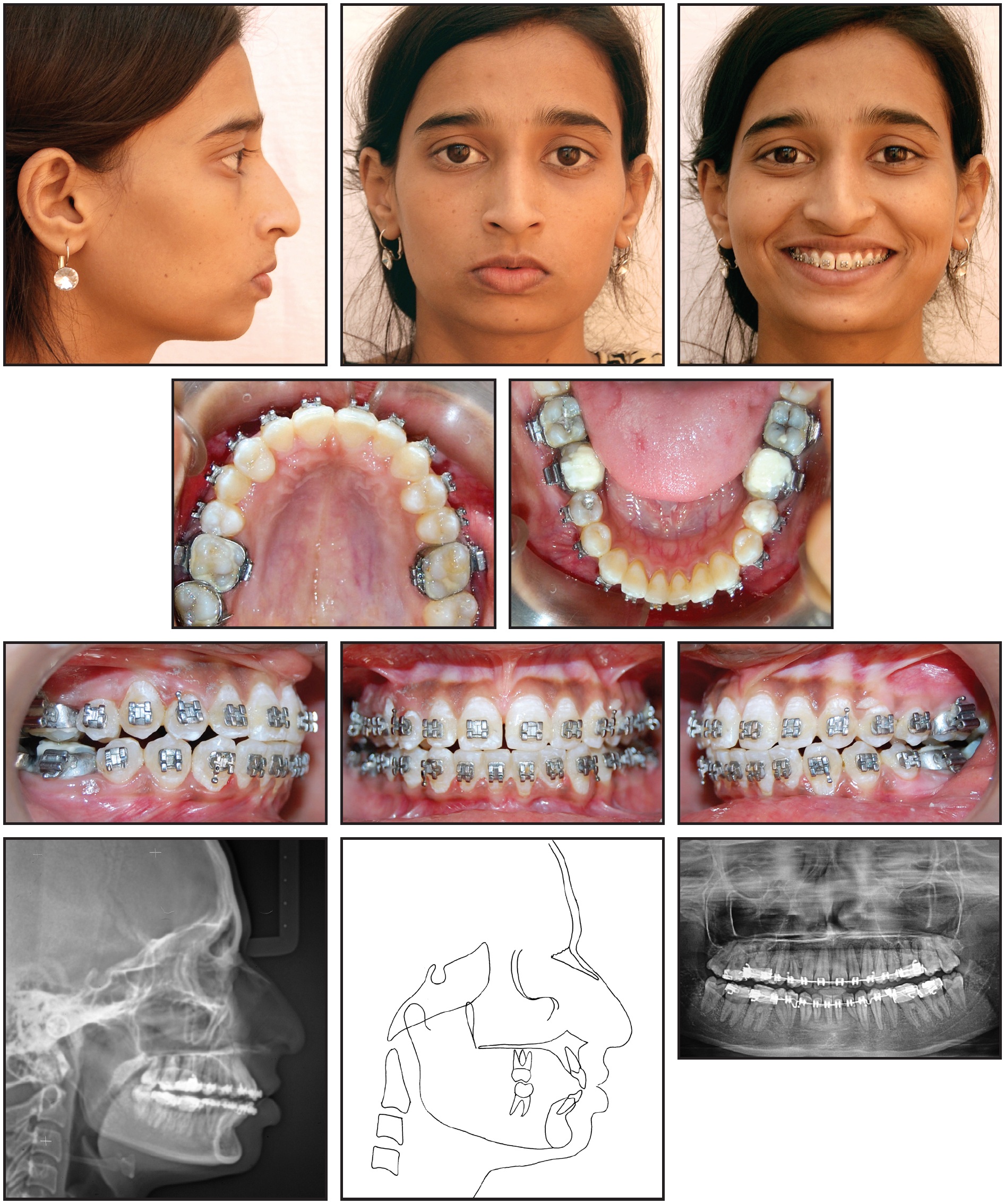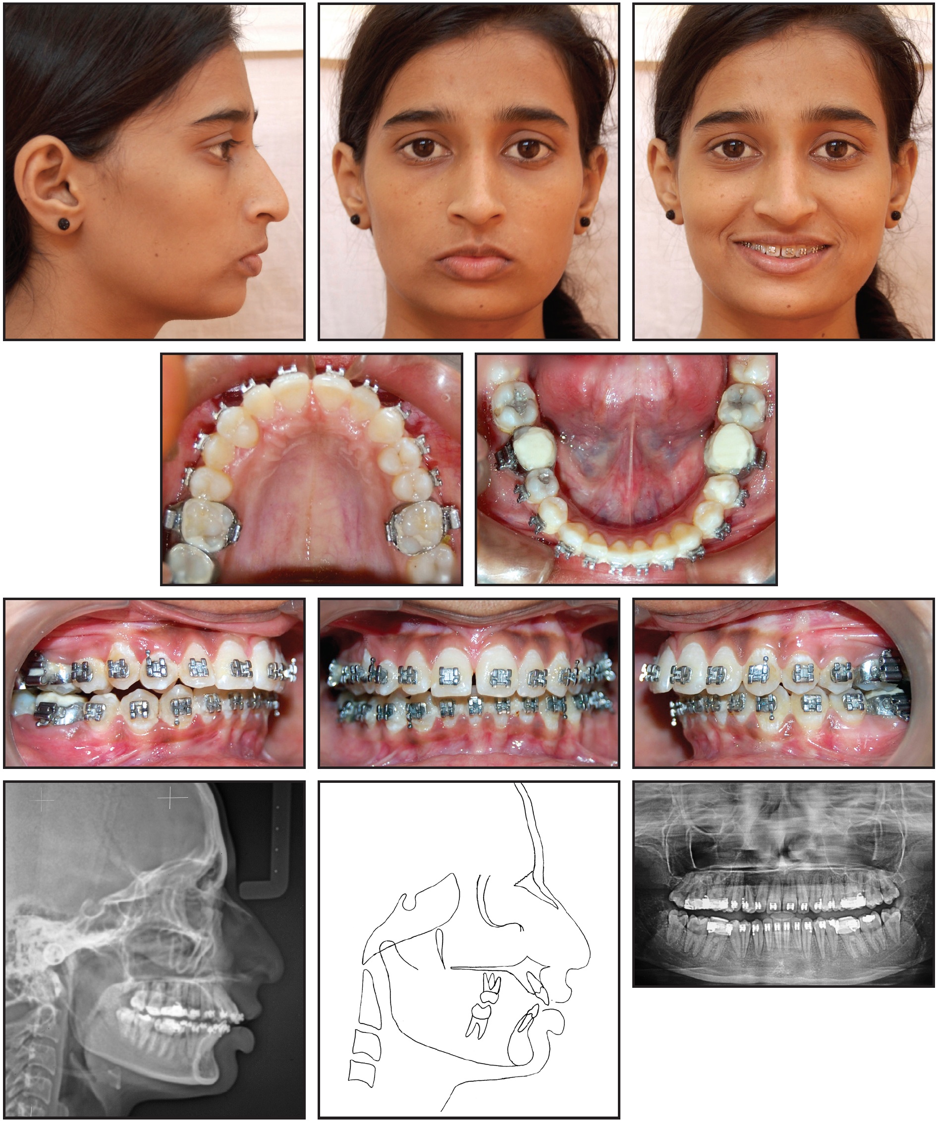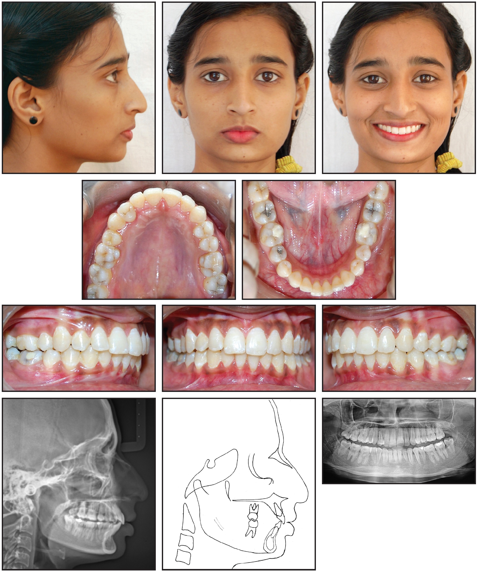 On clinical examination, the patient showed a mesoprosopic facial form with a convex profile and normal nasolabial angle, everted lower lip, and deep mentolabial sulcus. A midline diastema was associated with a high labial frenal attachment, and the upper midline was shifted 2mm to the right compared with the facial midline. The upper right canine was transposed with the first premolar. The patient had Class II molar relationships on both sides and a Class II canine relationship on the left, with an overjet of 11mm and an overbite of 6mm. Cephalometric examination indicated a skeletal Class II malocclusion (ANB = 5°) with a normal maxilla (SNA = 79°), a retrognathic mandible (SNB = 74°), and slightly proclined upper and lower incisors (Table 1). The growth pattern was horizontal. The panoramic radiograph confirmed the presence of all teeth, including the third molars.