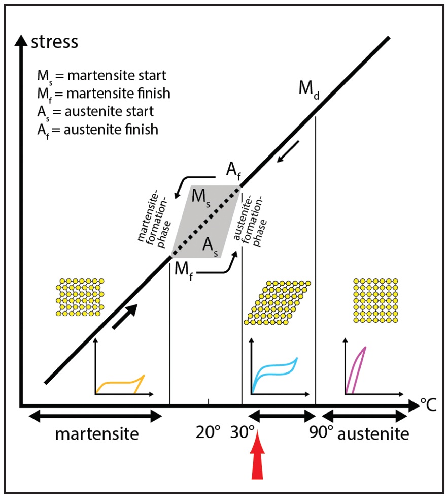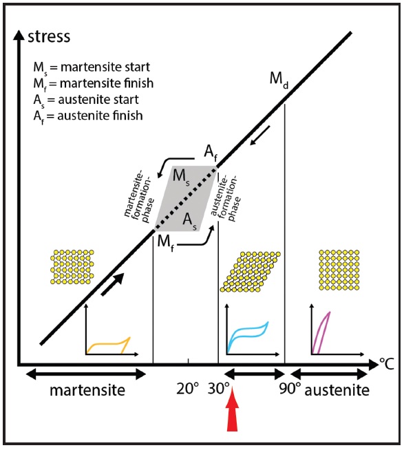 Fig. 1 During stress-related transition from martensitic to austenitic phase, optimal superelastic properties occur at body temperature (red arrow).