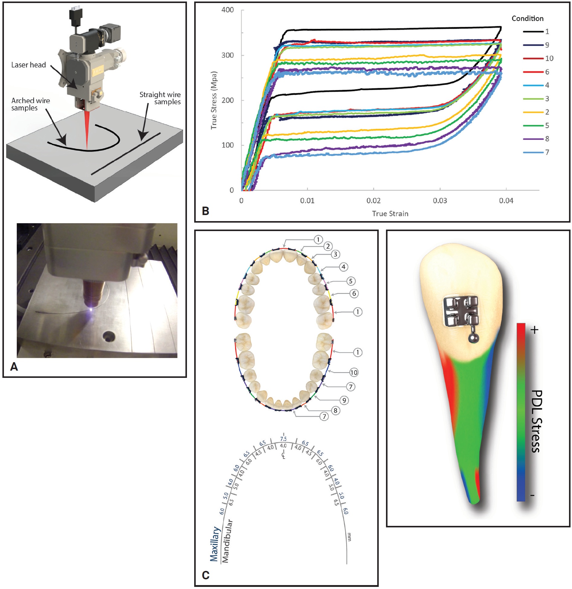 Fig. 2 A. SmartArch* wires produced with multiple memory material technology.17 B. As many as 10 levels of stiffness can be incorporated into a Copper NiTi** archwire. C. Key considerations include interbracket distances and stress on periodontal ligament (PDL).