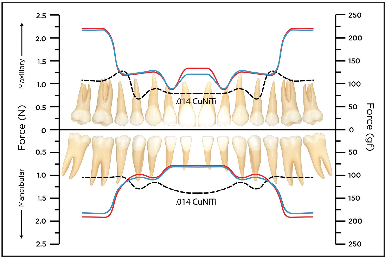 Fig. 3 Comparison of ideal force20 (red line) and forces delivered by traditional nickel titanium archwires (dotted line) and SmartArch archwires (blue).