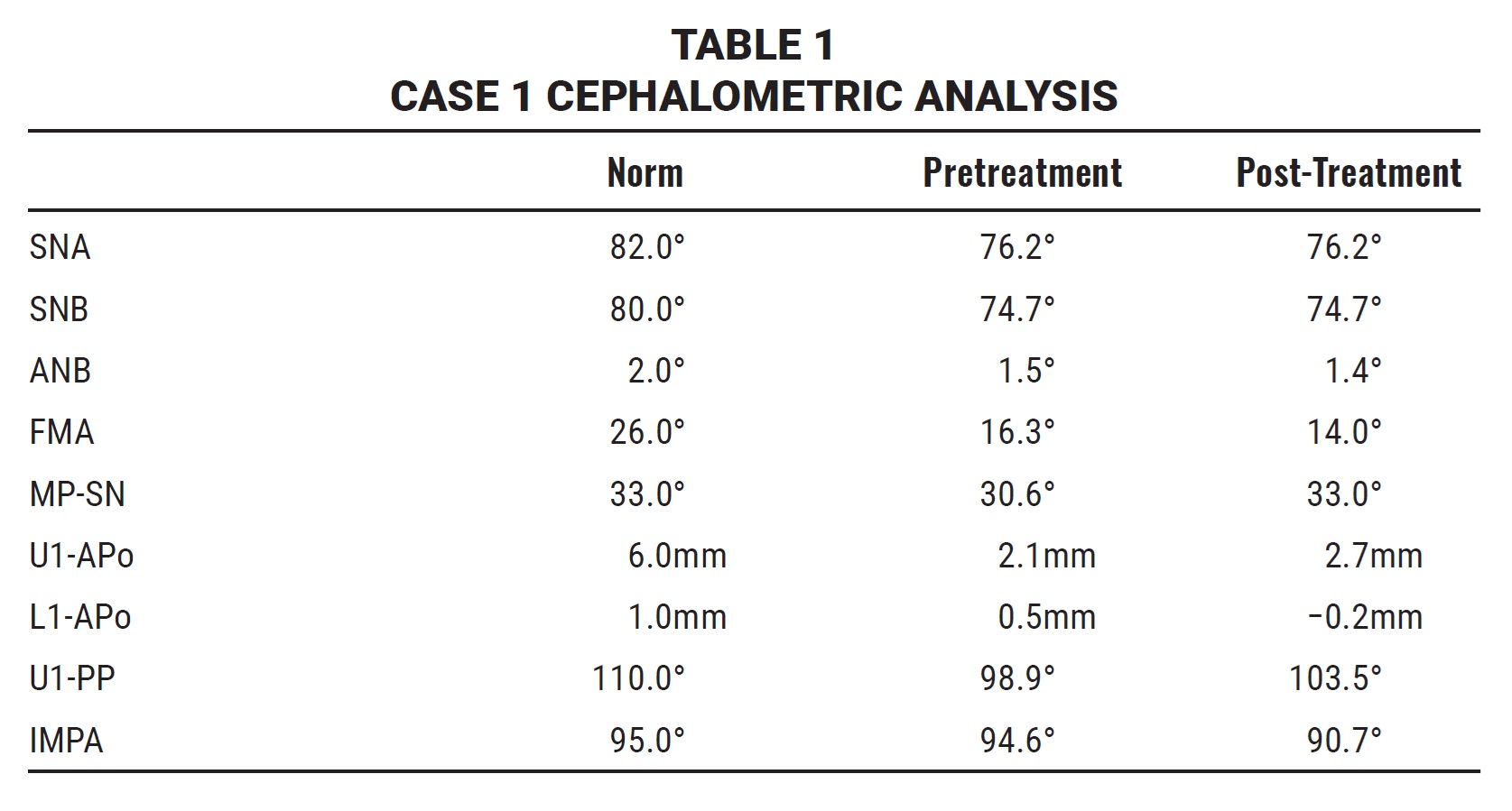 Post-treatment records demonstrated good dental alignment, proper seating, and functional occlusion (Fig. 8, Table 1). An appropriate overbite was established, and the buccal segments were uprighted and expanded, resulting in a beautiful, broad smile. The maxillary arch asymmetry was corrected.