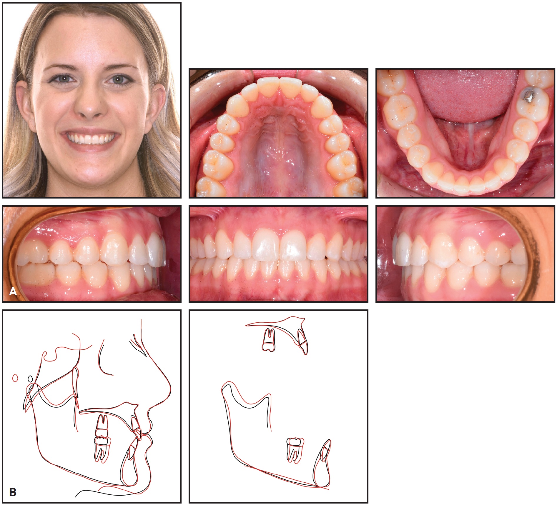 Fig. 8 Case 1. A. Patient after 35 weeks of treatment. B. Superimposition of pre- and post-treatment cephalometric tracings.