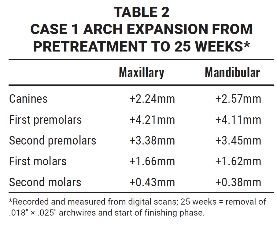 The patient’s response to the SmartArch archwires was consistent with what I expected from an arch-development standpoint (Table 2). Still, a few subtle adjustments could have led to even greater clinical efficiency. The .018" × .025" archwires were placed at five weeks because of the loss of the upper right second molar bracket. I believe less undermining resorption would have been required if the initial archwire had been allowed another three weeks to work, potentially saving four to five weeks of treatment time. In addition, hooks were placed on the upper canines at 20 weeks for attachment of Class II elastics. This created an indeterminate mechanical situation, in which the amount and location of hyalinized PDL could not be determined. A better clinical approach might have been to wait for the posted stainless steel wires to be placed, thus creating a more efficient determinate system, before initiating elastic wear.