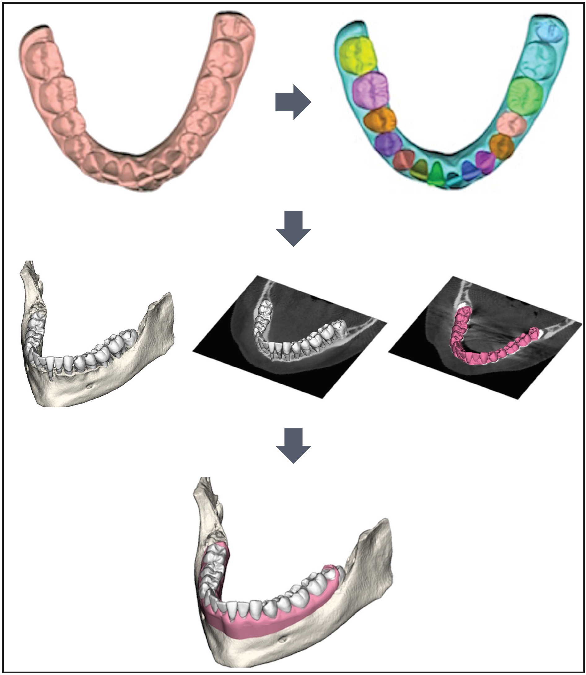 Fig. 1 Process beginning with three-dimensional digital scan through segmentation to final multi-body digital model of mandibular bone, gingivae, and teeth.
