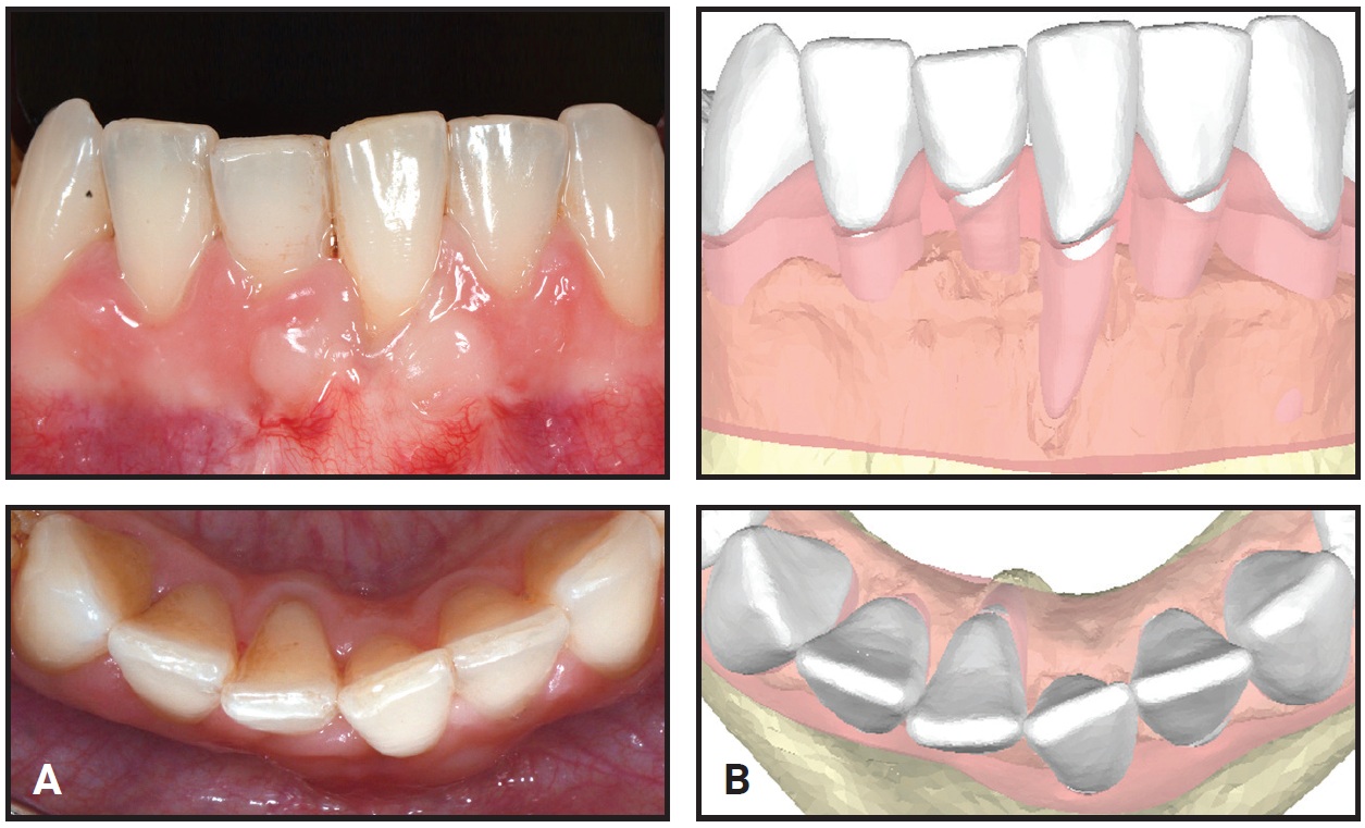 Fig. 2 A. 32-year-old female patient with gingival recession on buccally displaced lower left central incisor before treatment. B. Digital scan.