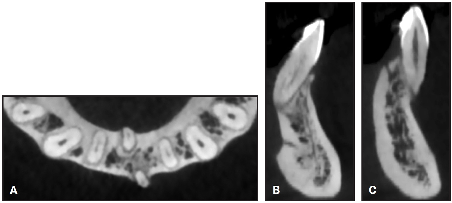 Fig. 3 A. Displaced lower central incisors. B. Right incisor outside lingual cortical bone. C. Left incisor outside buccal cortical bone.