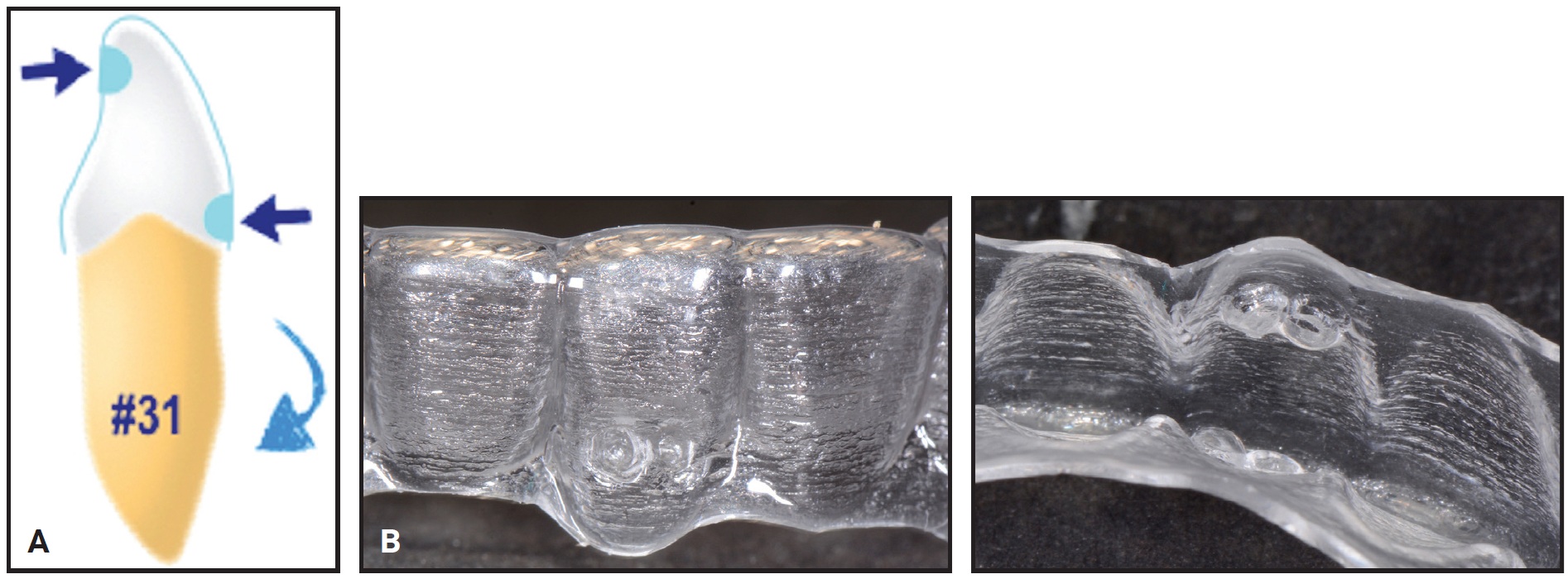 Fig. 4 A. Pressure points (divots) in aligner move force closer to center of resistance and thus create force couple for controlled root movement.21 B. Divots placed in aligner for lingual root torque of lower left central incisor.