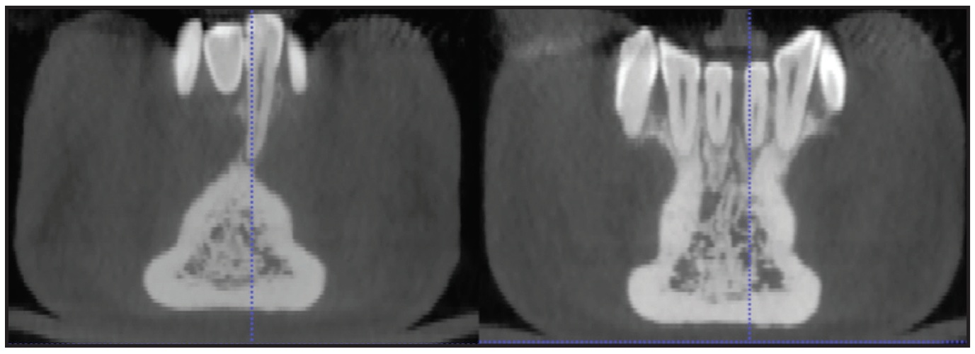 A 32-year-old female was evaluated by a periodontist and referred to the Department of Orthodontics at the University of Bologna (Fig. 2). She requested correction of her poor esthetics and relief from the marked dental sensitivity caused by gingival recession on the lower left central incisor, which seemed buccally displaced. The patient’s general dentist had tried to cover the recession, but advised that the tooth needed to be extracted. CBCT showed the root of the lower left central incisor outside its buccal cortical bone and the root of the lower right central incisor outside its lingual cortical bone (Fig. 3).