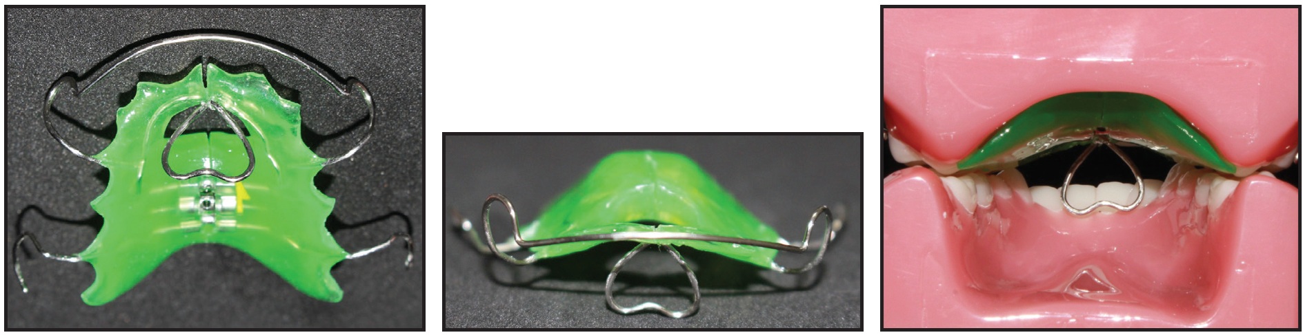 A lingual 3-3 retainer was bonded in the lower arch, and a Hawley-type retainer was delivered for the upper arch. At bedtime, the Tongue Rehabilitator could be inserted into the telescopic tube of the retainer’s acrylic palatal plate. This approach fit well with the patient’s routine, since he worked with the public and his speech was affected when he was wearing the device.