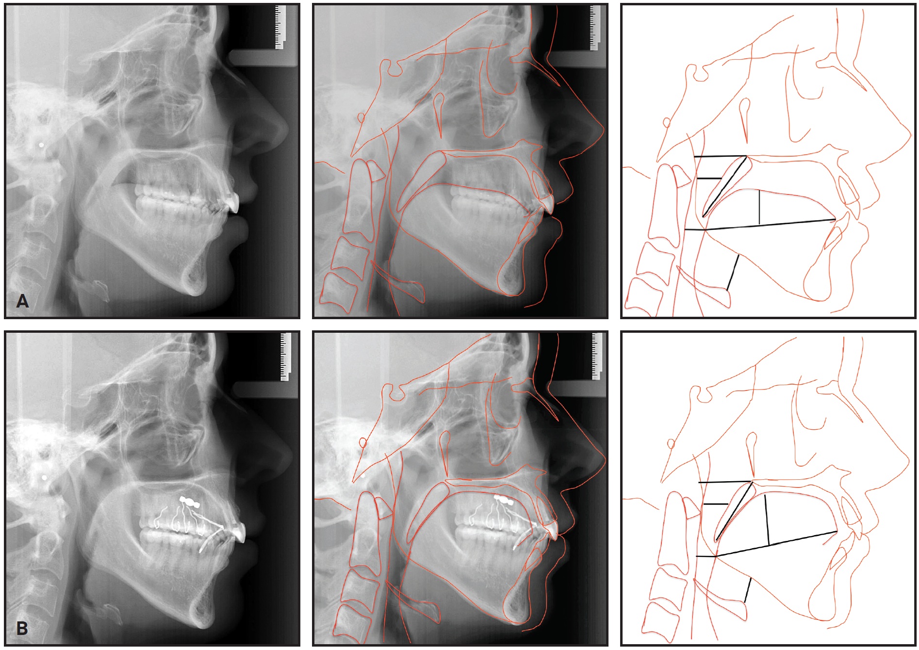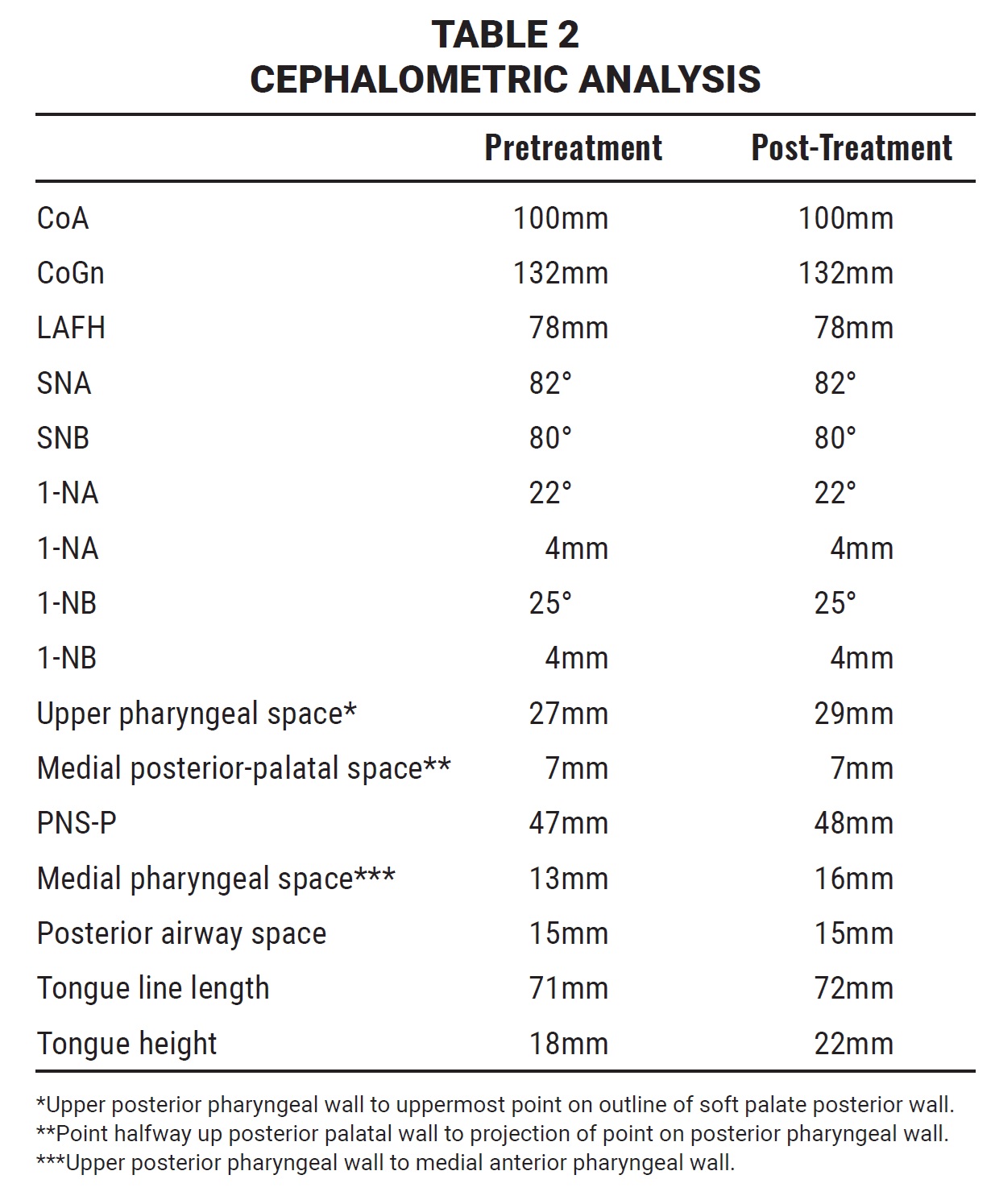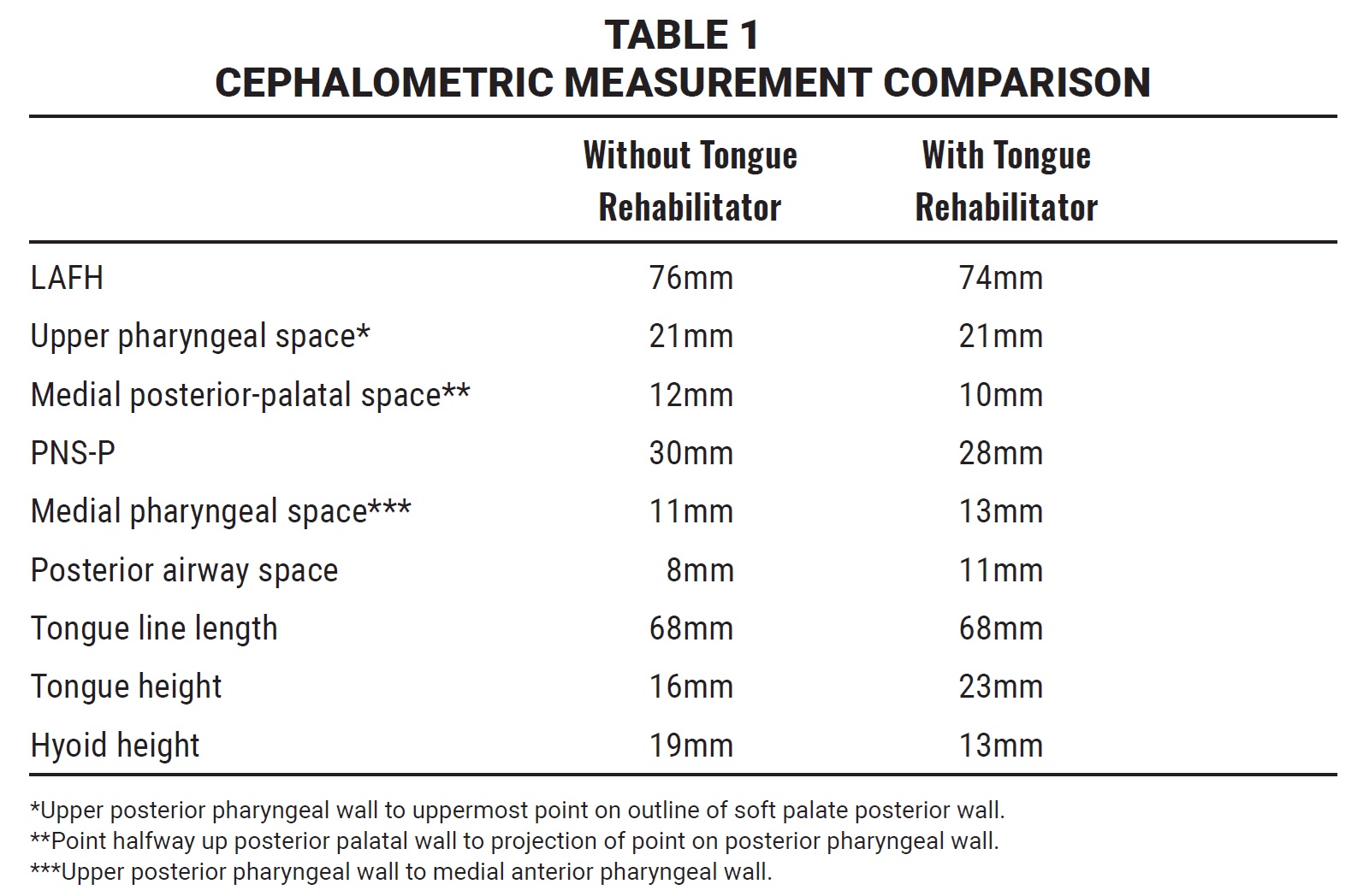 In the patient shown here, with the appliance in place, the tongue was 7mm higher, the hyoid was 6mm lower, and the soft palate (PNS-P) was 2mm shorter ([table=1][Table 1[/table]). Projecting the tongue forward and upward promotes lip seal during swallowing, which helps open the posterior airway and reduce snoring to foster restorative sleep.