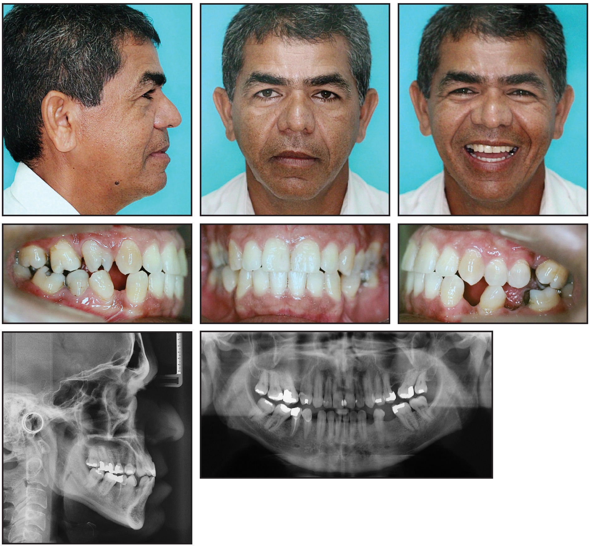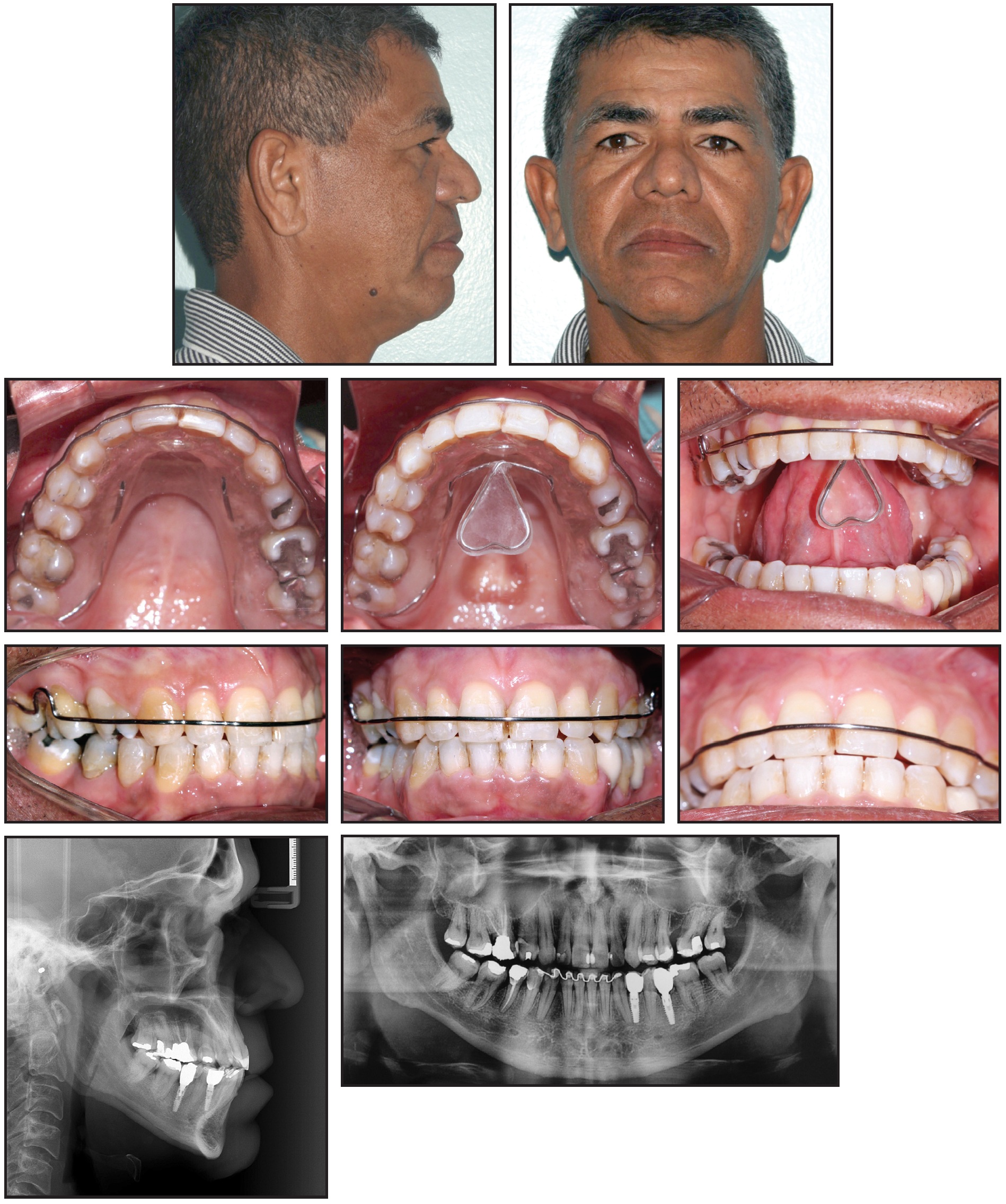 After being presented with several options, the patient agreed to orthodontic treatment that would involve improving the occlusion and redistributing the edentulous spaces for subsequent rehabilitation with implants and prostheses. Because he had a large tongue volume and no significant skeletal factors contributing to the upper airway obstruction, we decided to utilize the Tongue Rehabilitator along with fixed orthodontic appliances.