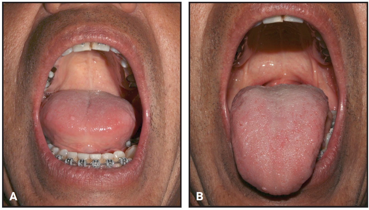 Fig. 2 38-year-old female patient without (A) and with (B) Tongue Rehabilitator in position.