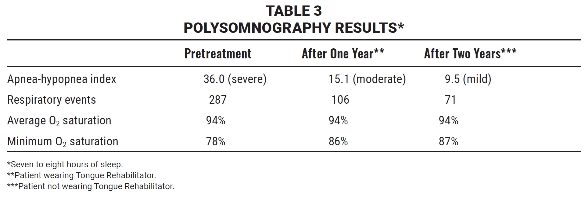 After two years of using the Tongue Rehabilitator at night, the patient underwent a third polysomnography test without the device, resulting in an AHI of 9.5 per hour over eight hours of sleep. He experienced 71 respiratory events (0 central, 71 obstructive, and 0 mixed) and an average O2 saturation of 94%, ranging from 87% to 98%. The patient stopped wearing the Tongue Rehabilitator at this point.