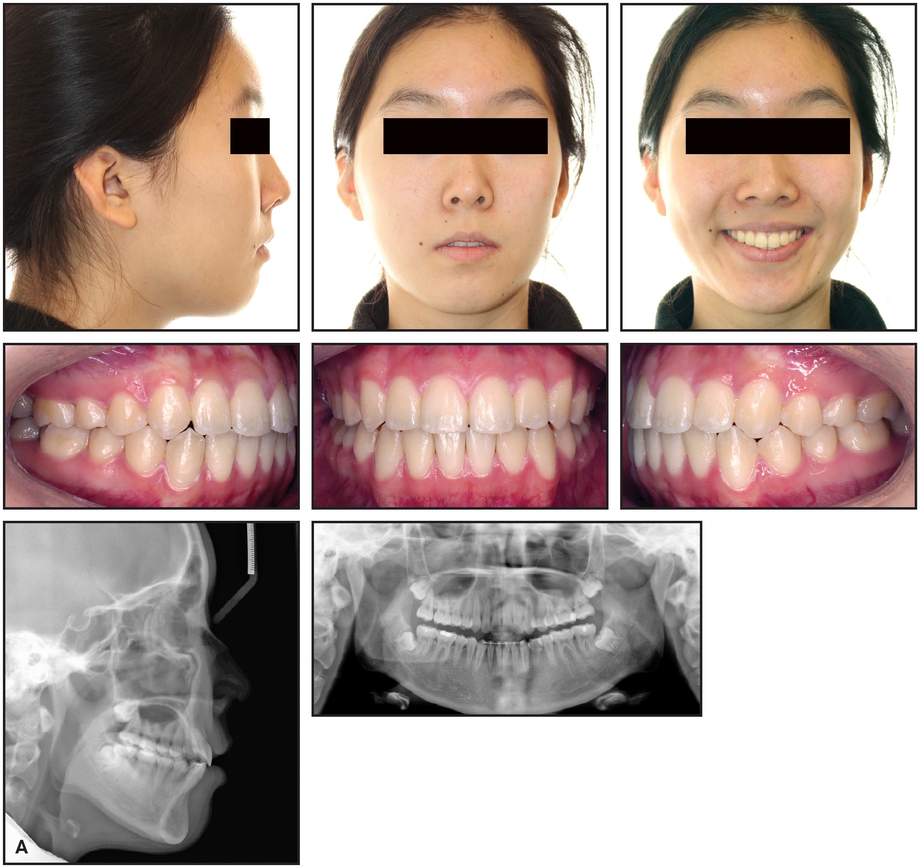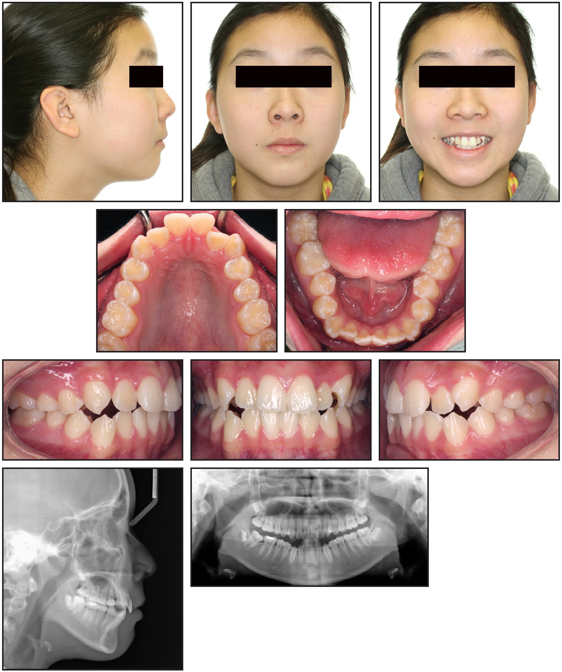 A 14-year-old female presented with the chief complaint of crowding (Fig. 1). She had a mildly convex facial profile with excessive lower anterior facial height and obtuse nasolabial and mentolabial angles, as well as a consonant smile arc with 1mm of gingival display in smiling. Intraoral examination found a 3mm overjet, a 1mm overbite at the incisor level, 2mm of open bite in the canine regions, and Class I molar and canine relationships.