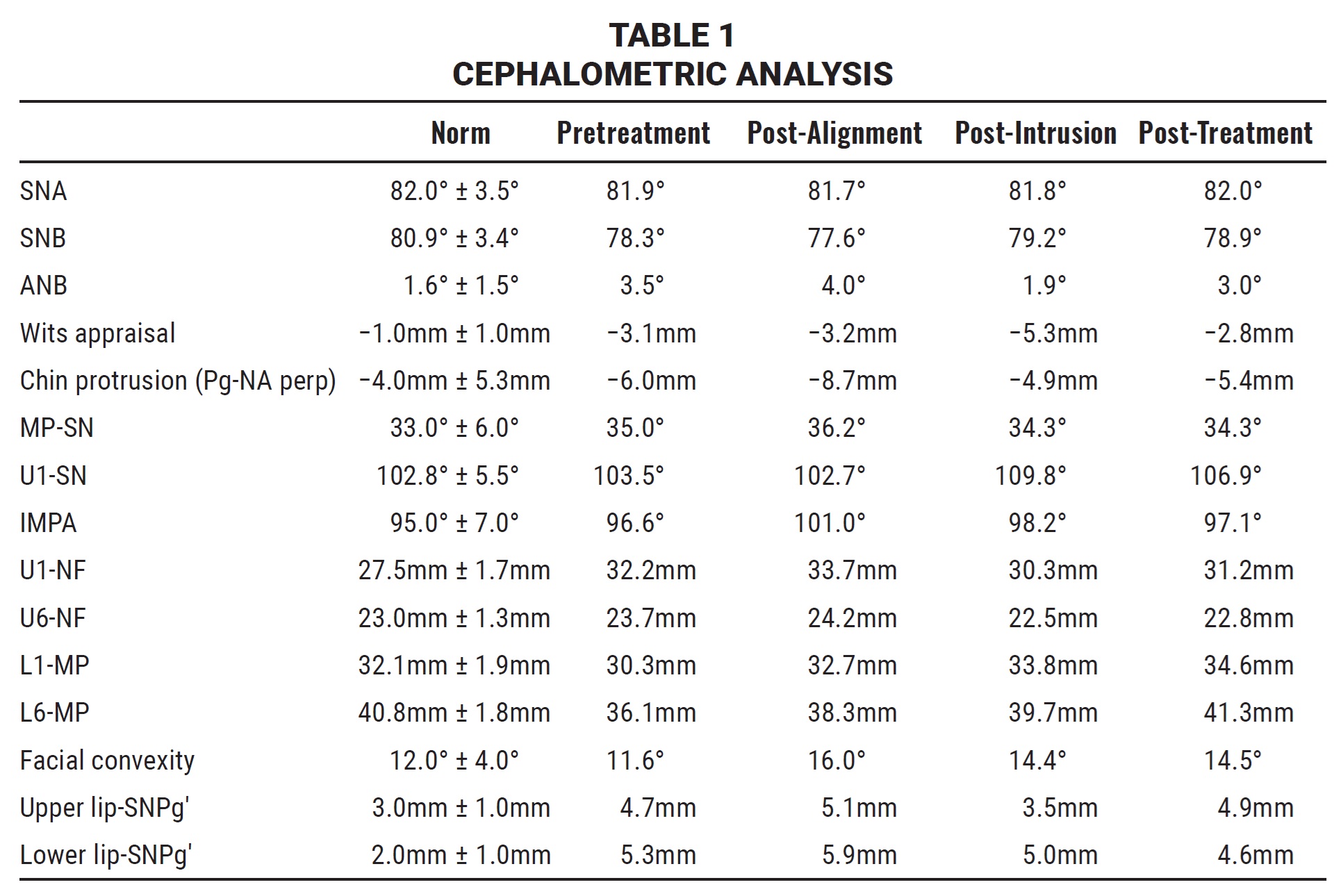 Cephalometric analysis indicated a slightly convex hard-tissue profile and mildly hyperdivergent growth pattern (Table 1). Vertically, the mandibular plane angle was slightly increased, and the distances from the upper and lower incisor apices to the palatal and mandibular planes were excessive. The upper and lower incisor inclinations were normal.