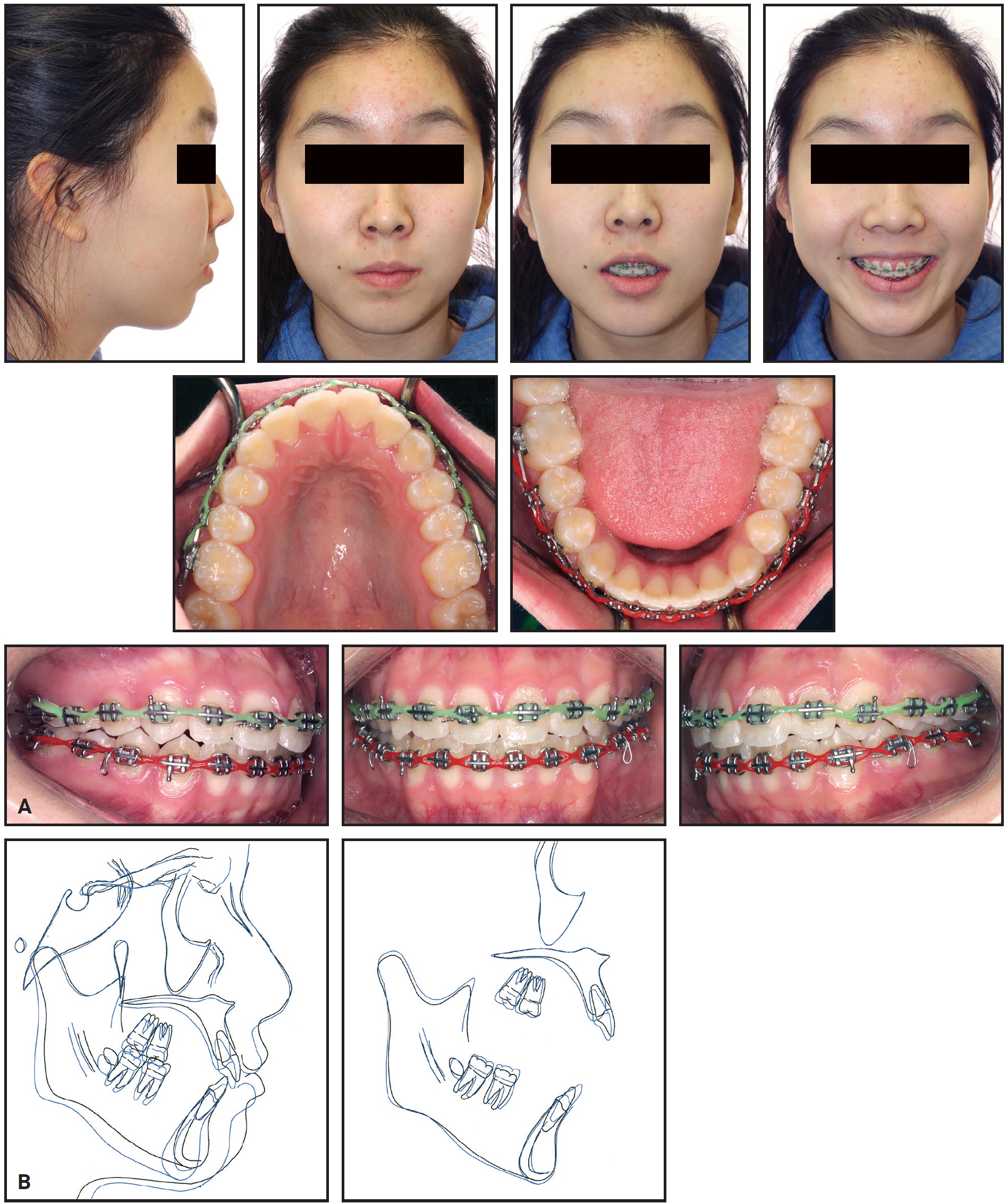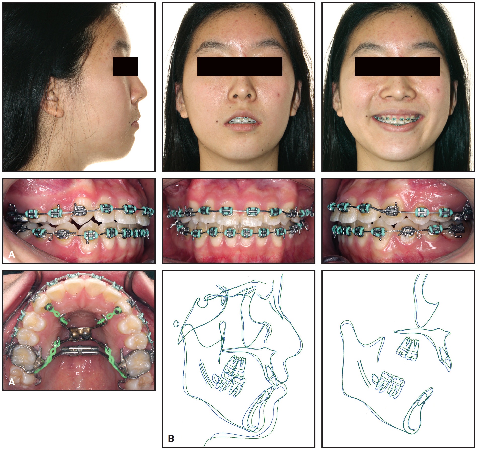 Fig. 2 A. After 17 months of leveling and alignment, showing excessive incisor and gingival display, increased interlabial gap, and reduced chin projection, with adequate occlusal relationships. B. Superimposition of pretreatment (black) and progress (blue) cephalometric tracings, confirming backward mandibular rotation and reduced chin prominence.