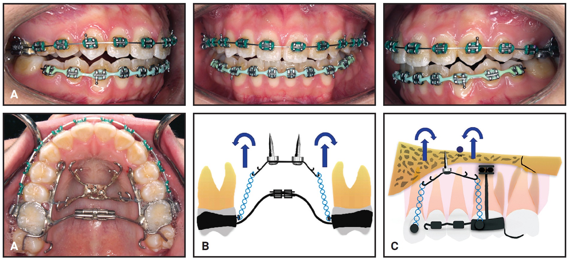 Buccal or palatal TADs have been used to support intrusion of the posterior teeth and correction of anterior open bite, especially in adult patients.10,11 From a biomechanical perspective, to intrude the entire maxillary dentition, the appliance design should allow the application of force vectors of different magnitudes in multiple directions. In this case, the cemented appliance with power arms and the modified RPE with hooks for force application provided the versatility and rigidity needed to achieve full-arch intrusion with only two palatal TADs.