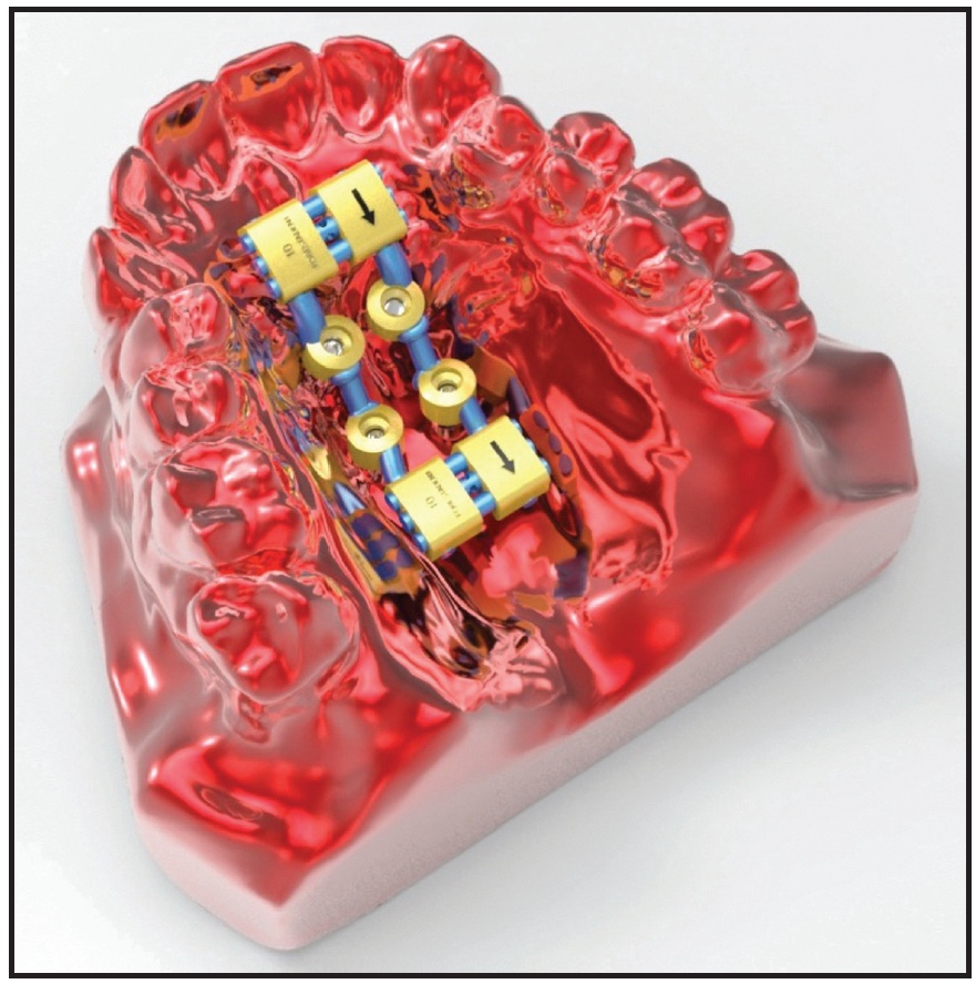 Because both the upper and lower arches had been leveled and aligned, the front teeth were correctly inclined, and the Class III molar and canine relationships were symmetrical, a “surgery first” approach was chosen to correct the transverse discrepancy. In consultation with the maxillofacial surgeon, we planned a noninvasive skeletal maxillary expansion with a boneborne RME. Because of the narrow and high palatal vault, a TSE was used with the MAPA System.