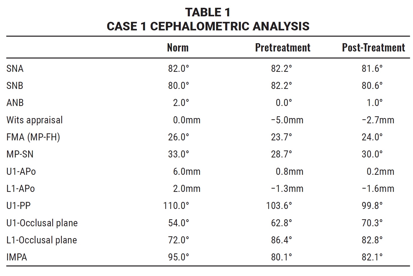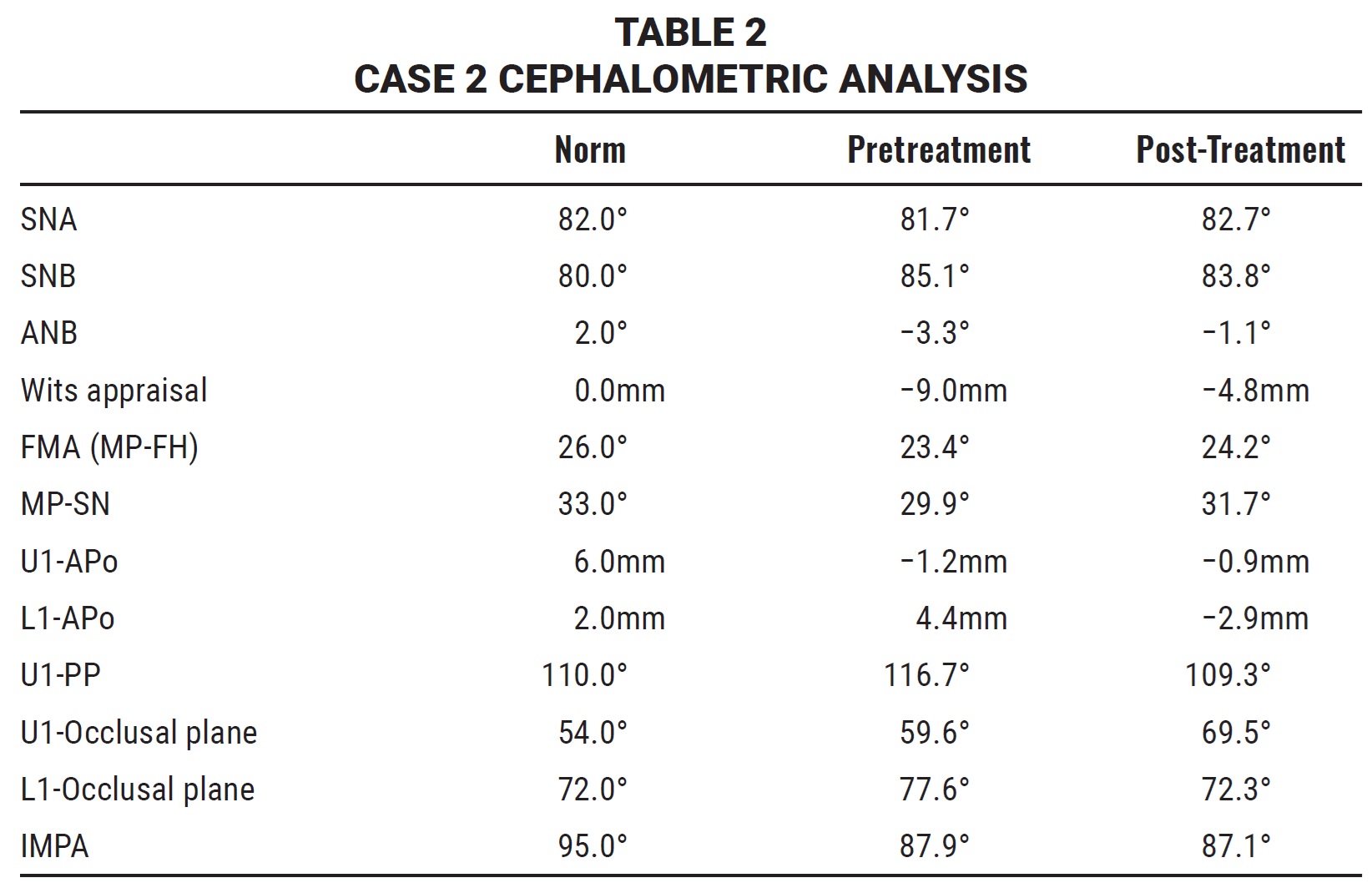 Cephalometric analysis (Table 2) confirmed a Class III relationship (ANB = −3.3°, Wits appraisal = −9mm). The skeletal growth pattern was normodivergent (FMA = 23.4°). The upper incisors were mesially inclined with respect to the palatal plane (U1-PP = 116.7°), and the lower incisors were normally inclined (IMPA = 87.9°).