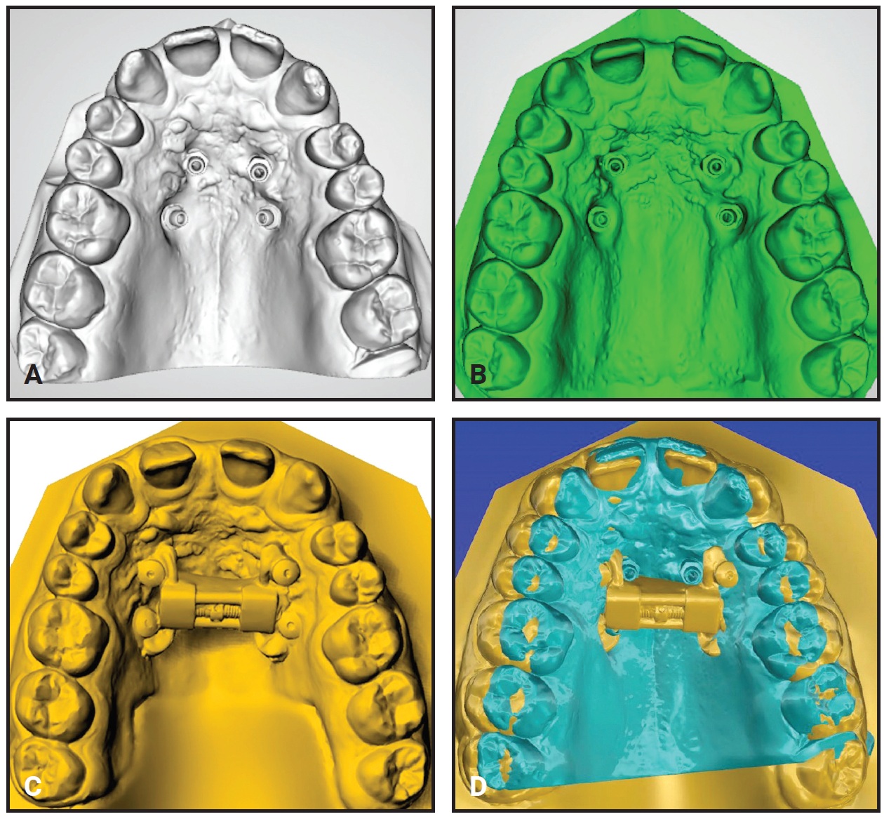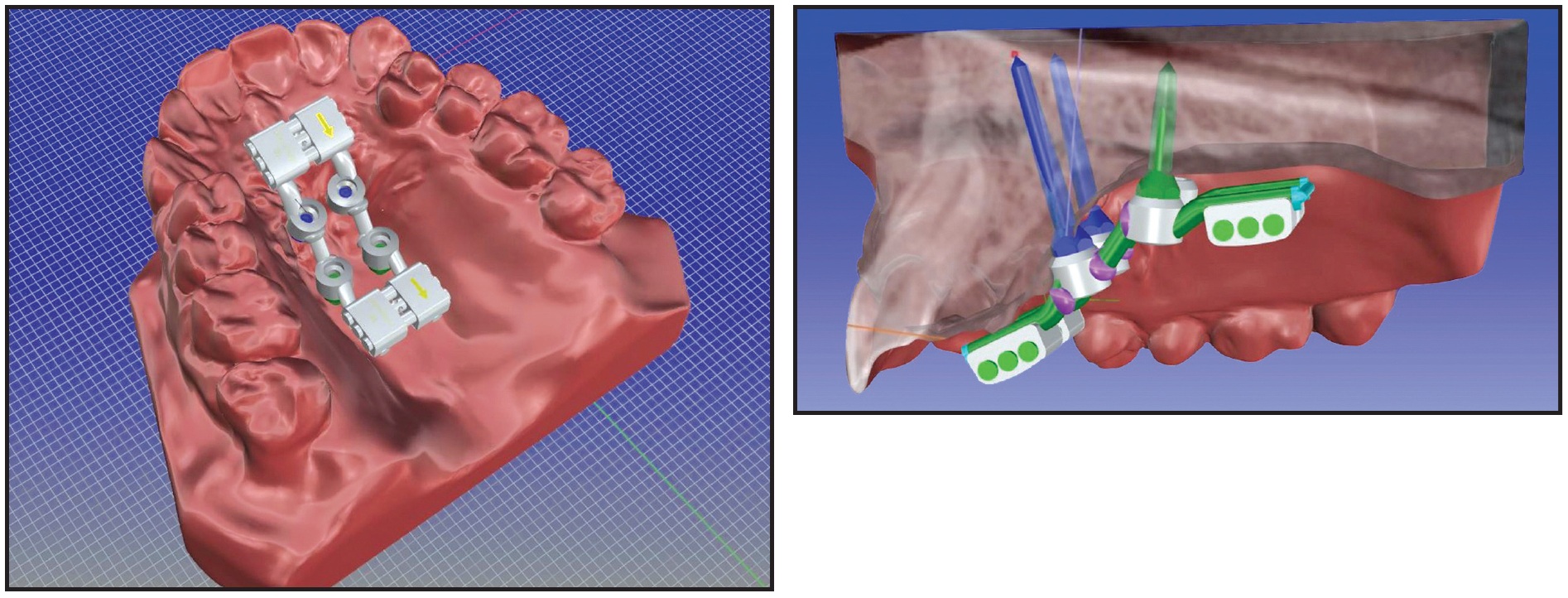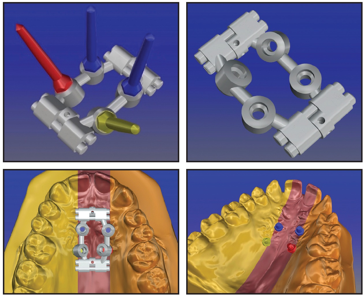Another alternative is to use miniscrew-assisted boneborne and toothborne RME. Evidence suggests it is possible to avoid surgery and still achieve successful expansion of the midpalatal suture, with minimal buccal tipping or undesirable periodontal effects, by inserting palatal miniscrews to anchor the expander.9,10 Miniscrews placed in the paramedian anterior palate have a low failure rate and are therefore suitable for supporting orthodontic appliances.11,12 To safely insert the device in the correct position, we use a three-dimensional surgical guide designed specifically for palatal application: the MAPA System.*13,14 By enabling accurate preoperative planning based on volumetric tomography and customized software, the template ensures proper bicortical anchorage and parallelism of the implants.