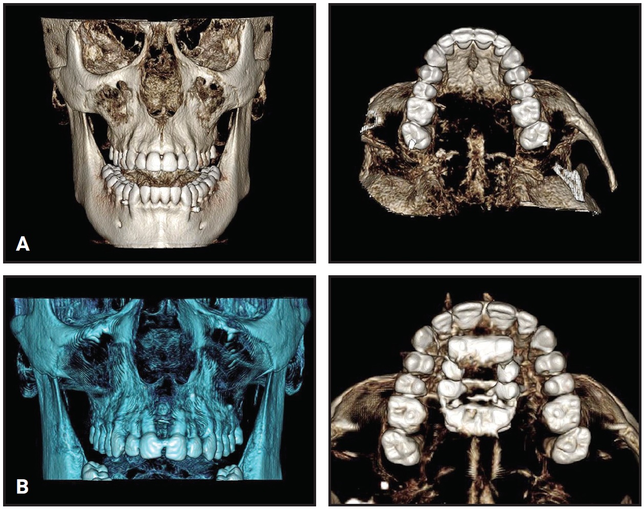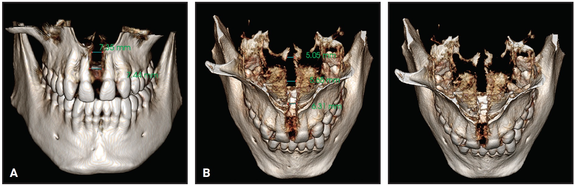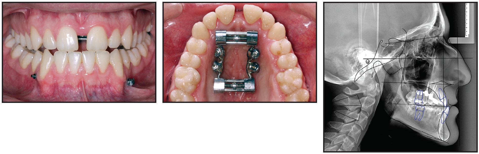 A maxillary deficiency was apparent from a frontal view. The dental midlines were coincident with the facial midline, and the lower third of the face was well balanced with the central and upper thirds. The patient exhibited a concave profile with a protrusive mandible and a backwardly positioned maxilla. Intraoral examination found Class III molar and canine relationships on the right and left sides, with no crowding in either arch (Fig 10B). Two miniscrews, which had been used as anterior anchorage for the previous orthodontic treatment, were present in the lower arch. Except for the lower first premolars, all teeth were present.