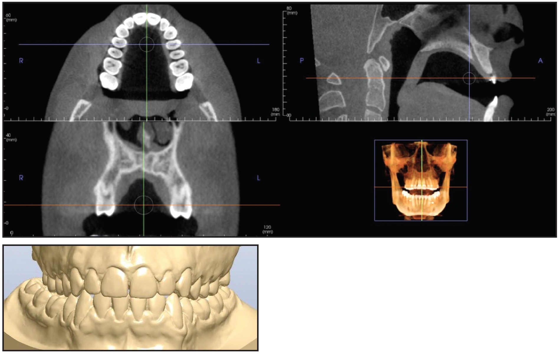 Fig. 11 Case 2. Transverse maxillary deficiency and bilateral crossbite apparent in cone-beam computed tomography and in diagnostic simulation of maxillary advancement surgery.