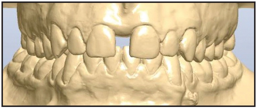From a frontal view, the patient’s face appeared harmonious, with the lower third proportional to the middle and the upper thirds. The mandibular symphysis was deviated to the left. He had a straight profile, a proper nasolabial angle, and a good maxillary bone relationship. Except for the missing upper lateral incisors, all teeth were present, including normally erupted third molars. Bilateral Class I molar relationships were observed, with a Class I canine relationship on the right side and Class II on the left. The lower arch was slightly crowded, and the midline was deviated to the left. The upper arch presented a central diastema and dental asymmetry because of the more distal position of the upper left quadrant. The adjacent teeth had not entirely migrated into the space of the missing lateral incisors, leaving diastemas, especially on the left side. A maxillary transverse deficiency had directly caused the left lateral crossbite (Fig. 2B.