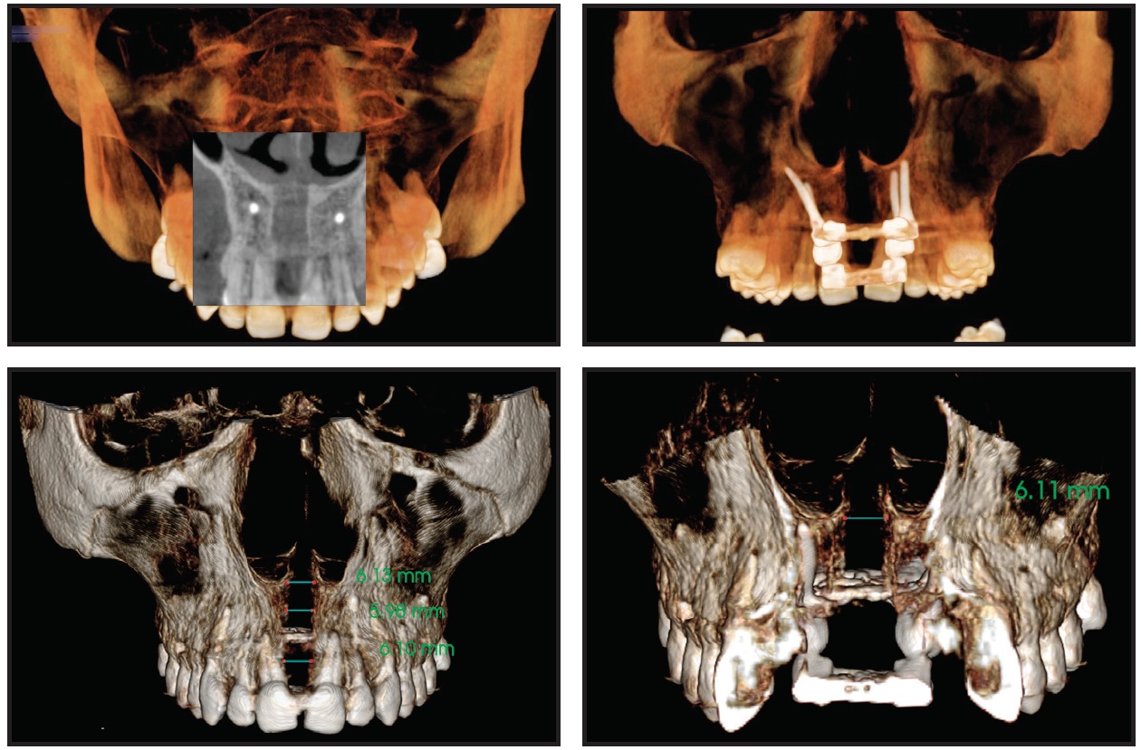 A six-month stabilization was planned after the end of maxillary expansion in each of our cases, although there is no evidence in the literature to suggest such a period. Because a double boneborne expander was used in each patient, no buccal tipping or molar protraction occurred. Transverse expansion was achieved by a purely skeletal and almost symmetrical expansion of the anterior and posterior areas of the palate, without any dental side effects. Once the transverse deficiency was resolved, each patient was ready to continue with a second phase of treatment according to the original plan. Digital design and the use of a 3D surgical guide with the MAPA System made the procedure simple for the clinician and minimally invasive for the patient, while protecting the anatomical structures.