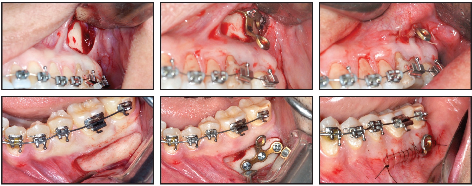 Fig. 4 Surgical procedure for installing T-shaped miniplates, which are bent to conform to patient anatomy and align with incision, keeping miniplates away from gingival margins and thus allowing proper hygiene.