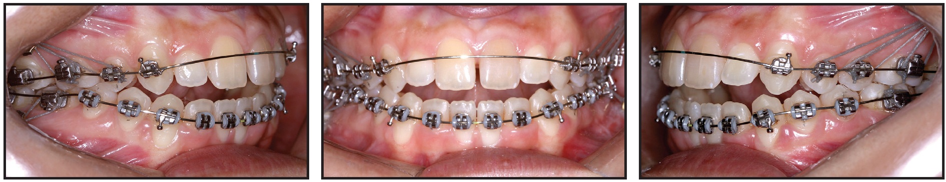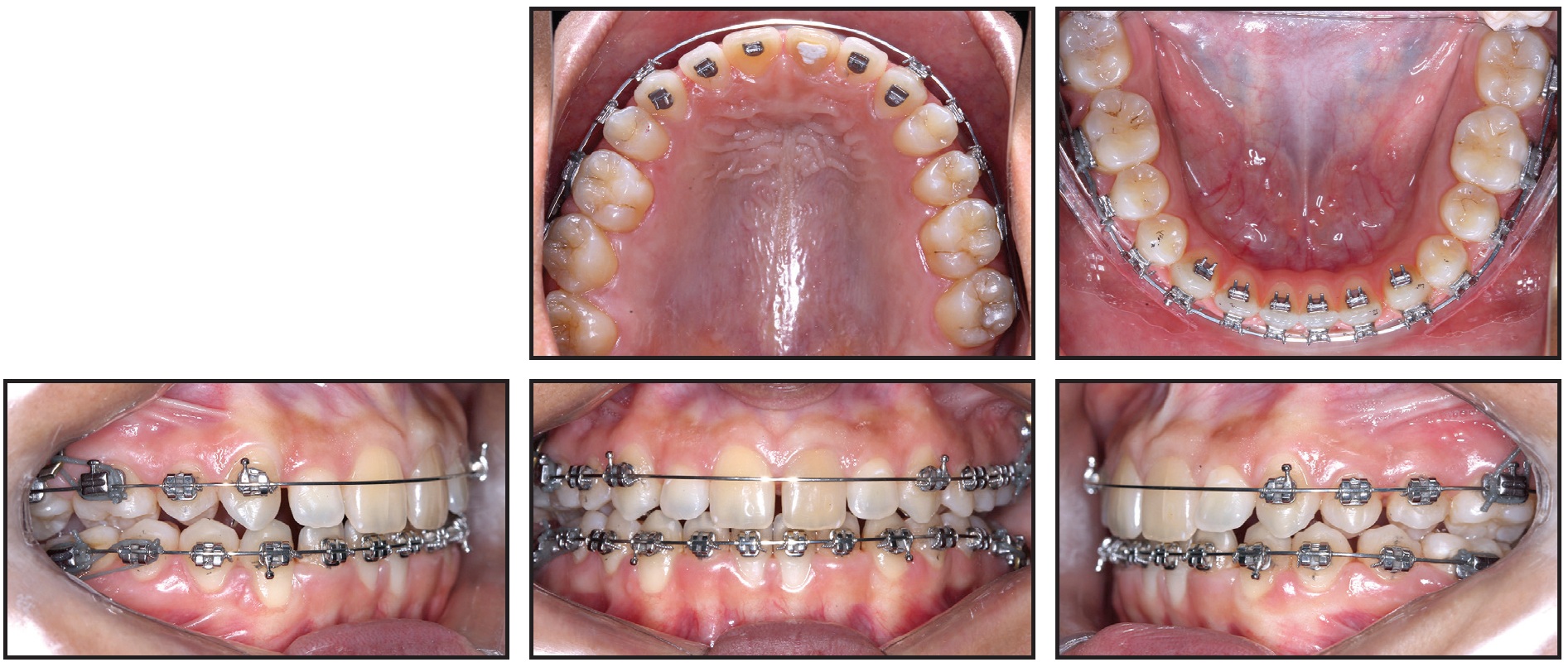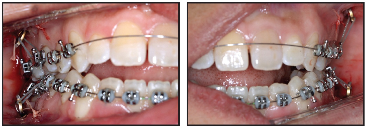 On the same day as the miniplate installation, orthodontic treatment began with placement of .018" × .028" Ricketts-prescription fixed appliances and .012" nickel titanium archwires in both arches (Fig. 5). The first molars were anchored to the miniplates with elastomeric ligatures. The upper central and lateral incisors were not included in the archwires while endodontic treatment of the central incisors was still in progress.