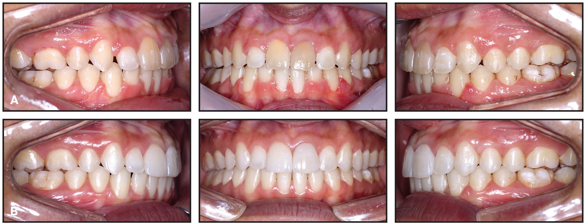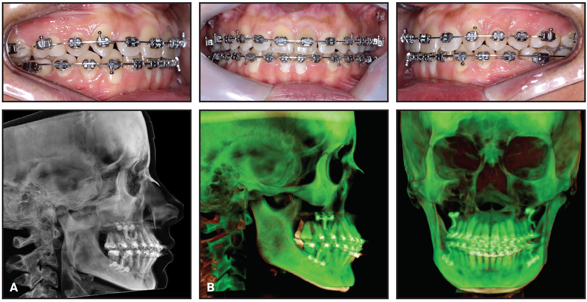 A technique has been described using mini-implants in the infrazygomatic crest to anchor maxillary posterior intrusive mechanics for the correction of skeletal open bite.25,26 Even though the infrazygomatic crest is not located between the dental roots, however, it is close to the apices, and it requires sufficient bone volume for stable insertion. A miniplate inserted at the base of the zygomatic pillar allows the use of greater force and range of motion. In the adult open-bite case shown here, miniplate anchorage enabled more intrusion of the posterior segments and the use of more attachments providing simultaneous 3D forces. Optimal results were achieved without the need for premolar extractions or orthognathic surgery—either of which could have worsened the patient’s good facial profile. Disadvantages of miniplates include a higher cost and the need for surgical procedures for their installation and removal, involving the risk of infection.