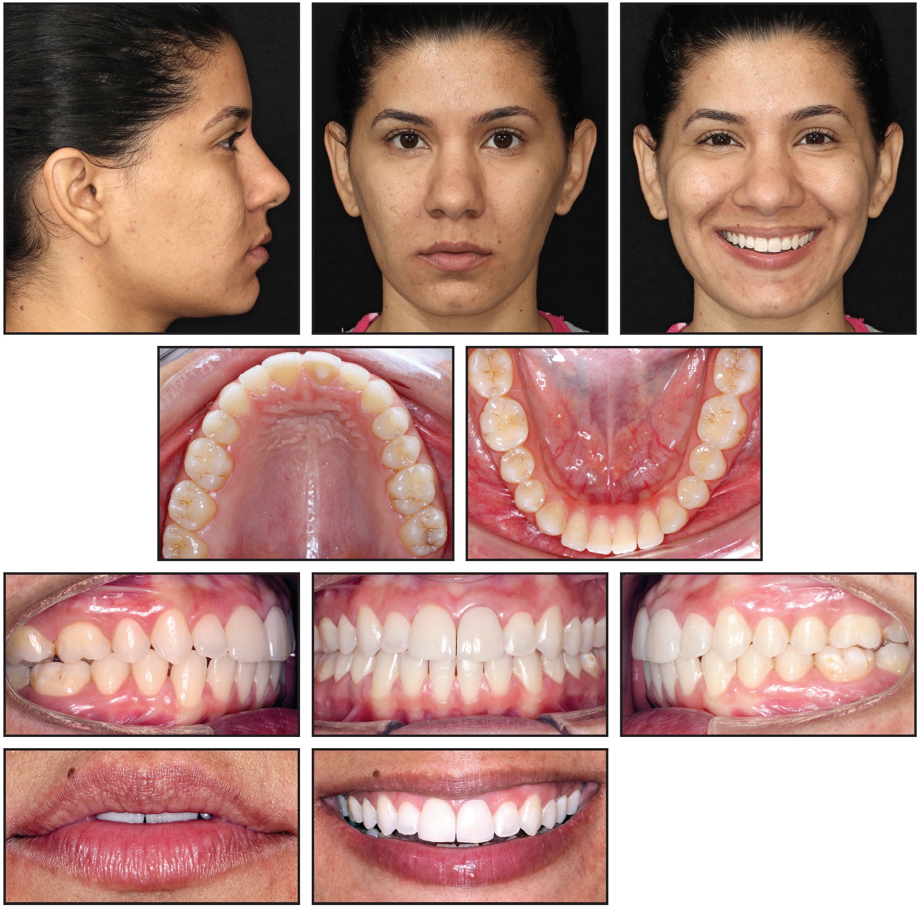 Orthodontic appliances were removed after 14 months of treatment (Fig. 10). The objectives of this phase had been met with the achievement of a functional and balanced occlusion. The patient was referred for gingivoplasty, whitening, and faceting procedures on the upper central incisors.