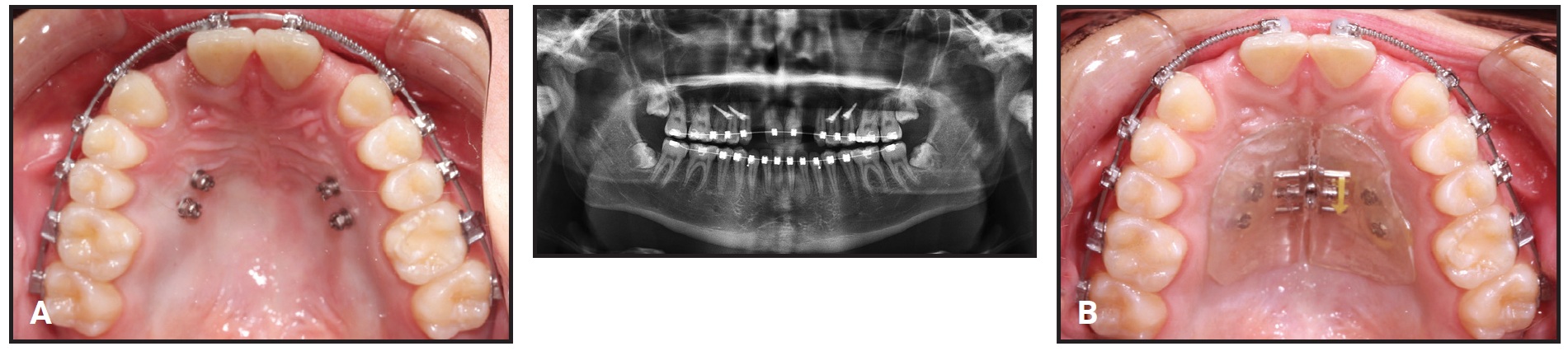 The MARPE was chosen over a conventional tooth-supported expander because of the patient’s age and potentially fused palatal suture.1 Four mini-implants would be used for enhanced bony support and to reduce the possibility of expander failure if one or two of the mini-implants were to dislodge. The maxillary anterior corticotomy was recommended over standard orthodontic extrusion because considerable tooth movement (>3mm) was indicated, and the supplemental bone support from the grafting could provide more upper lip support and tooth stability.3