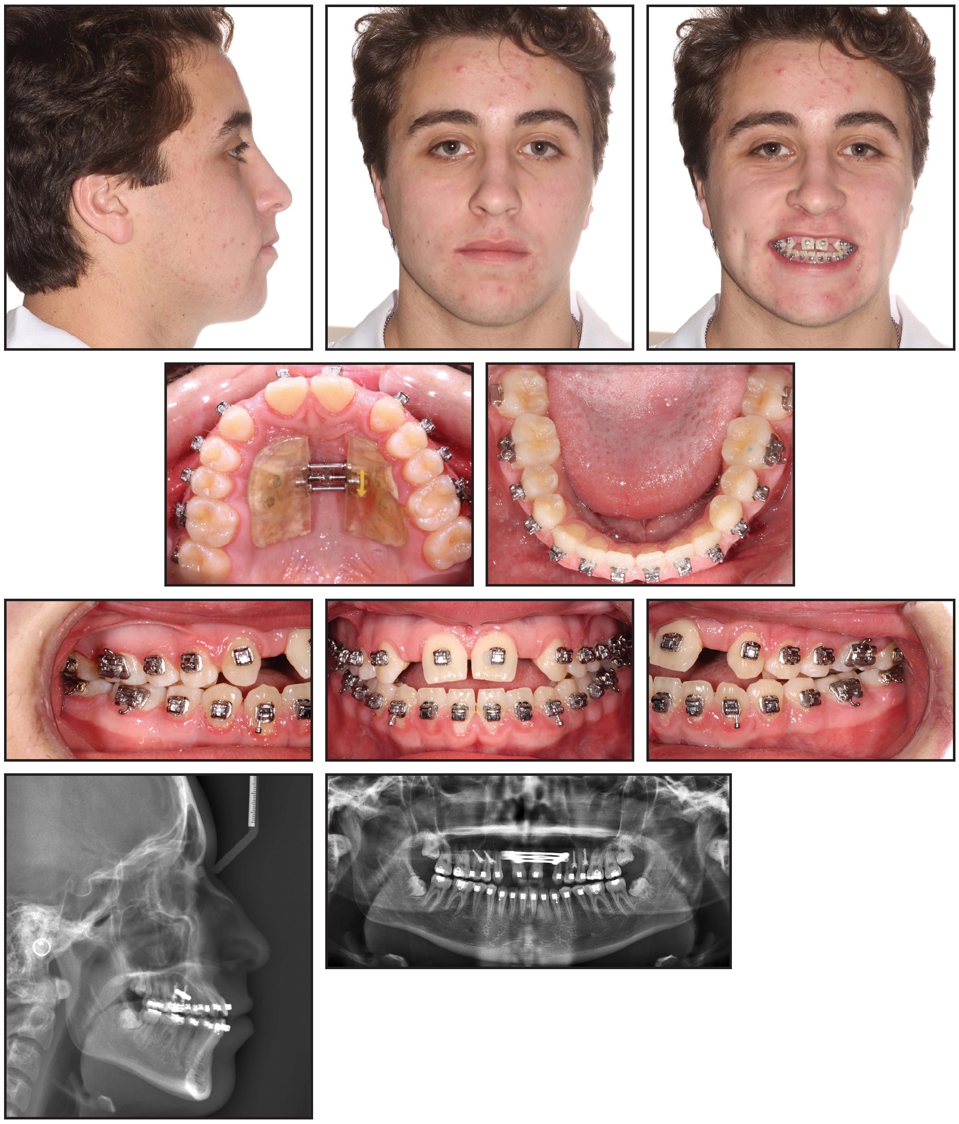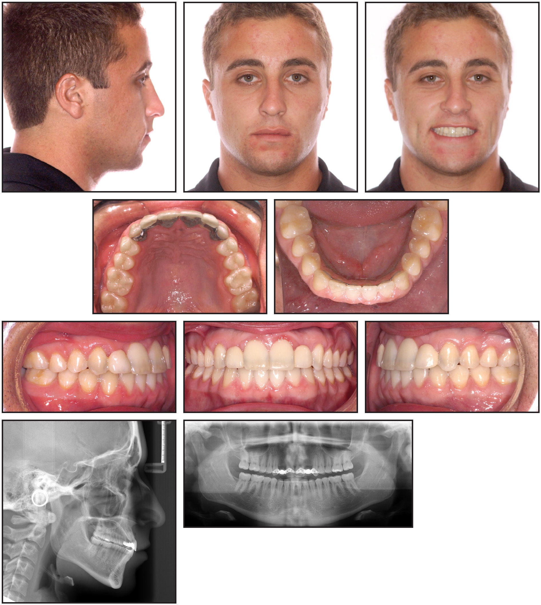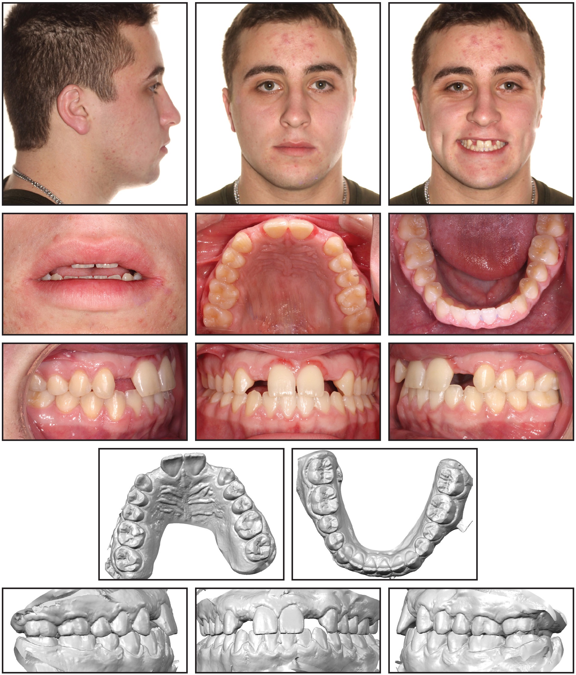 Fig. 1 17-year-old male patient with mild skeletal Class III pattern, congenitally missing upper lateral incisors, constricted arches, and anterior open bite after treatment by previous orthodontist (continued in next image).
