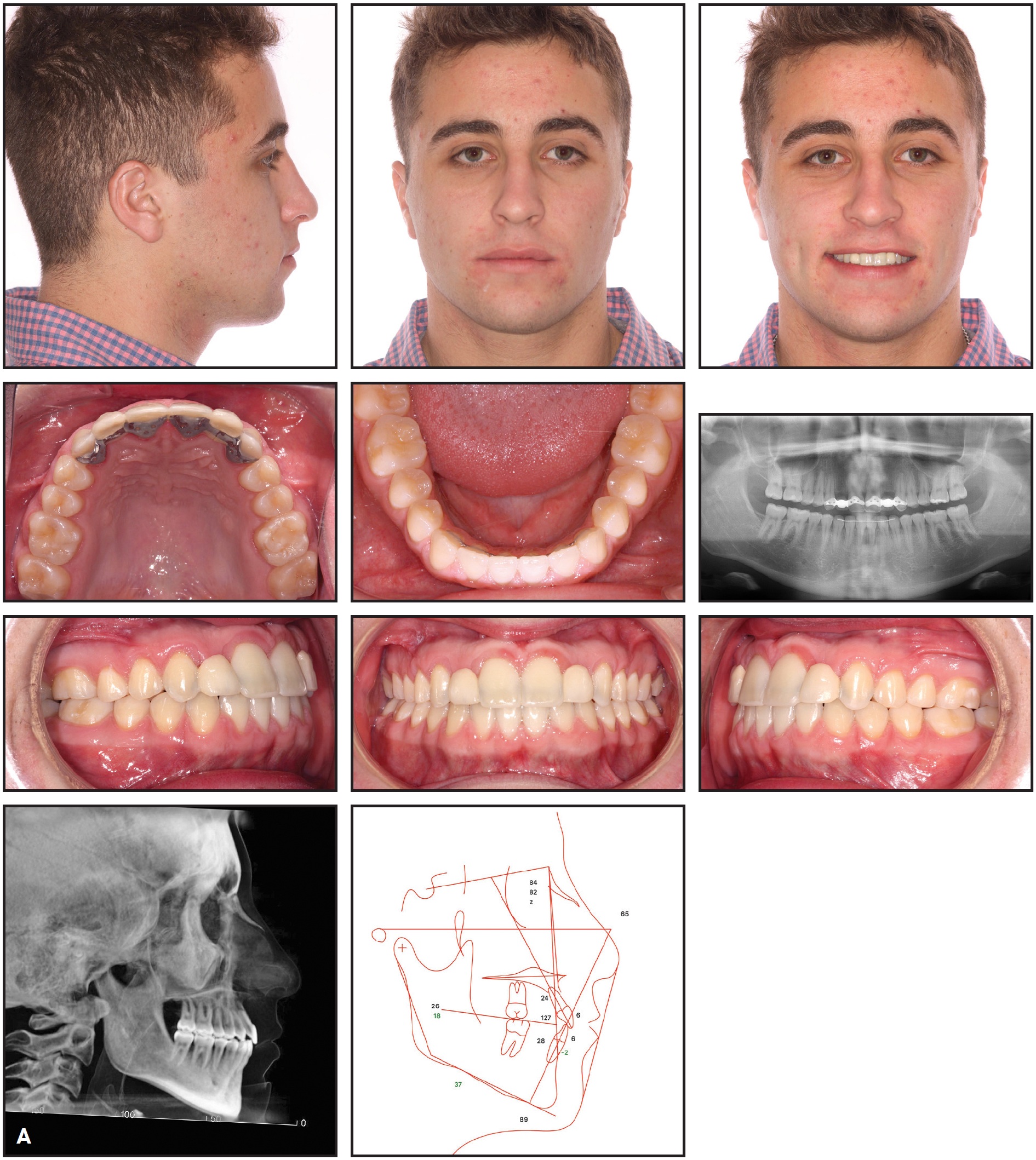 A Class I occlusion was achieved, with ideal overbite and overjet. The panoramic radiograph showed adequate root divergence and bone levels to allow future implants for the maxillary lateral incisors. The maxillary and mandibular posterior segments were uprighted, and the arches were coordinated. The maxillary canine width increased from 34.7mm to 37.1mm, and the maxillary molar width from 42.9mm to 45.3mm. The mandibular canine width increased from 27.3mm to 27.9mm, and the mandibular first molar width from 40.6mm to 44.4mm (Fig. 8B).