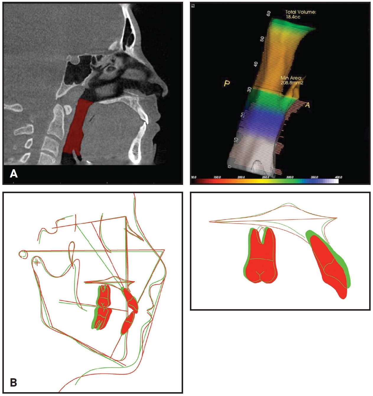 Fig. 8 (cont.) A. Patient after 18 months of multidisciplinary treatment. B. Superimposition of pretreatment (green) and post-treatment (red) cephalometric tracings.